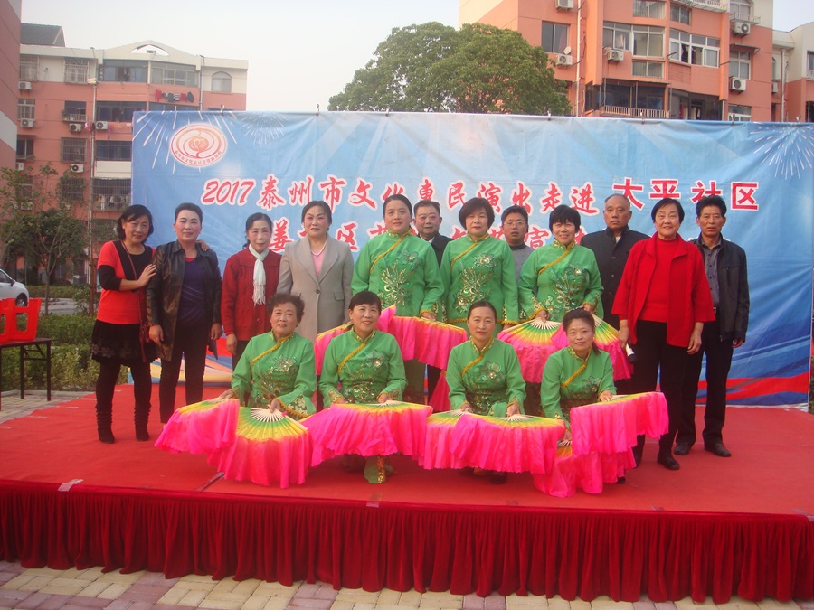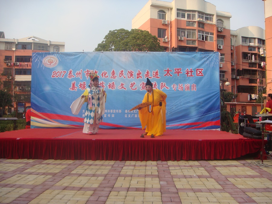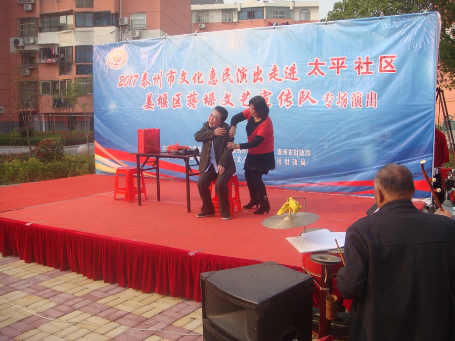 姜堰区蒋垛文艺宣传队走进罗塘街道太平社区,下午两点为太平社区居民献上了一台文艺节目,节目形式有戏剧,小品,表演唱,独唱,舞蹈等,近两个小时的演出,掌声不断,演出结束后,观众不愿意离去,都说:“欢迎你们再来”!