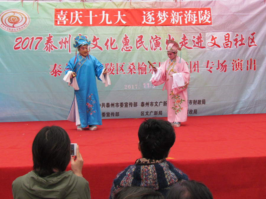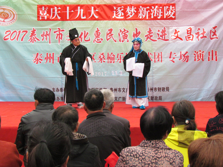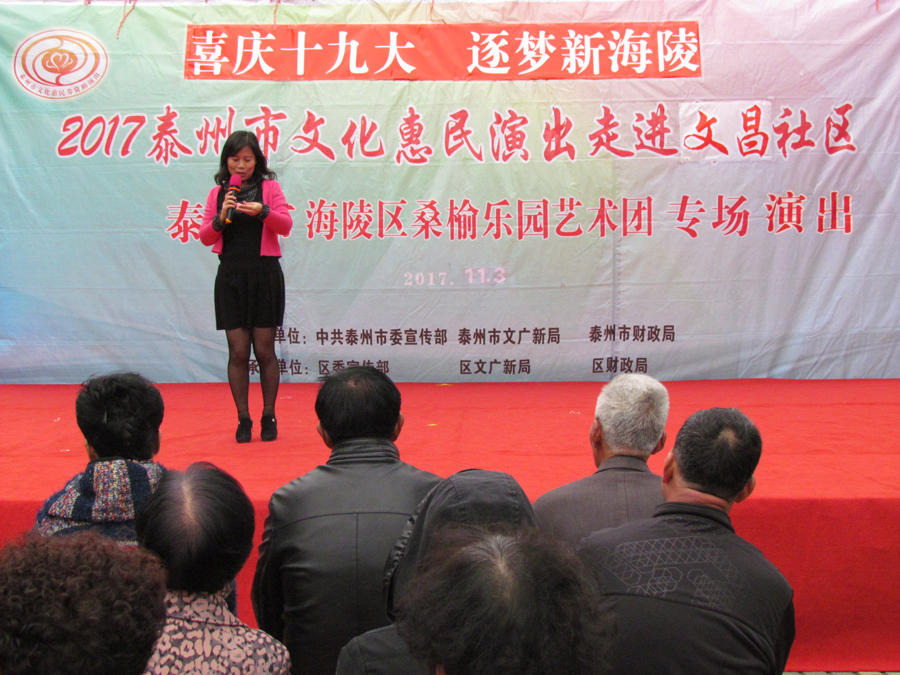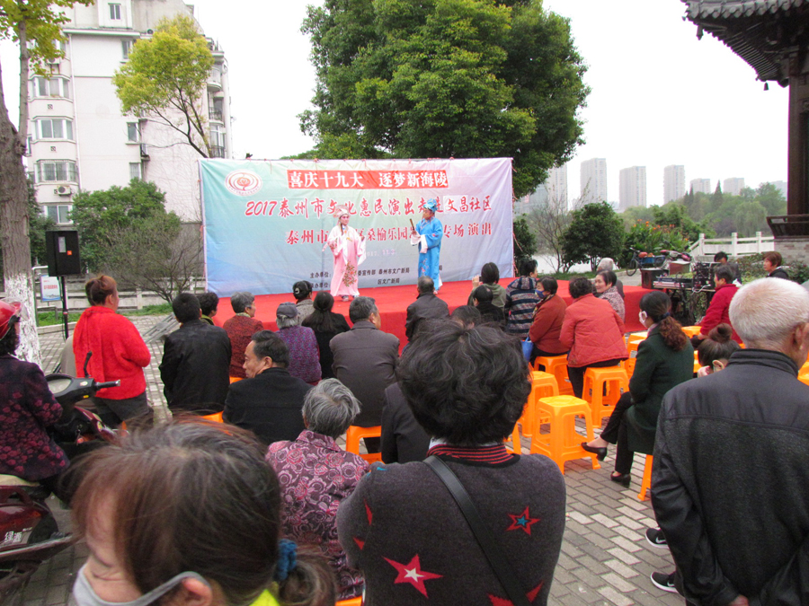 2017年11月3日下午,多云天气,秋高气爽,气候宜人,在海陵区南城河畔,文昌阁北侧文昌社区广场上,海陵区桑榆乐园艺术团为文昌社区的父老乡亲们送去了一台精彩的综合性文艺演出。有古筝演奏、快板、舞蹈、合唱、葫芦丝演奏,还有戏曲扬淮“十八相送”等等,200多名群众对每个节目都报以热烈的掌声,许多中、老年朋友竖起大拇指说“组织得好,演得好,唱得好。”精彩的演出在南城河北岸文昌阁旁与美丽的景色柔合成一道亮丽的风景线。