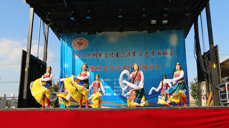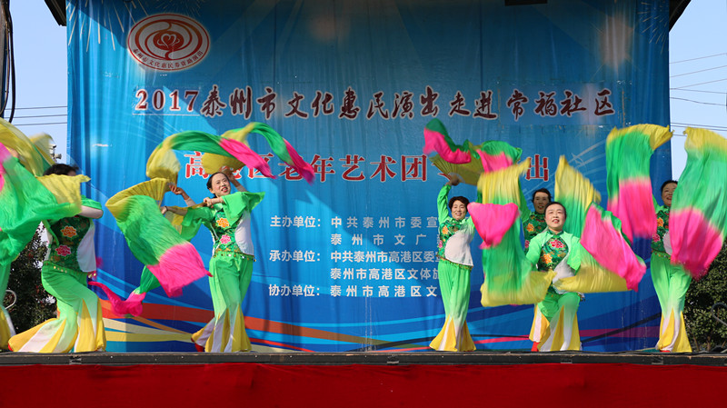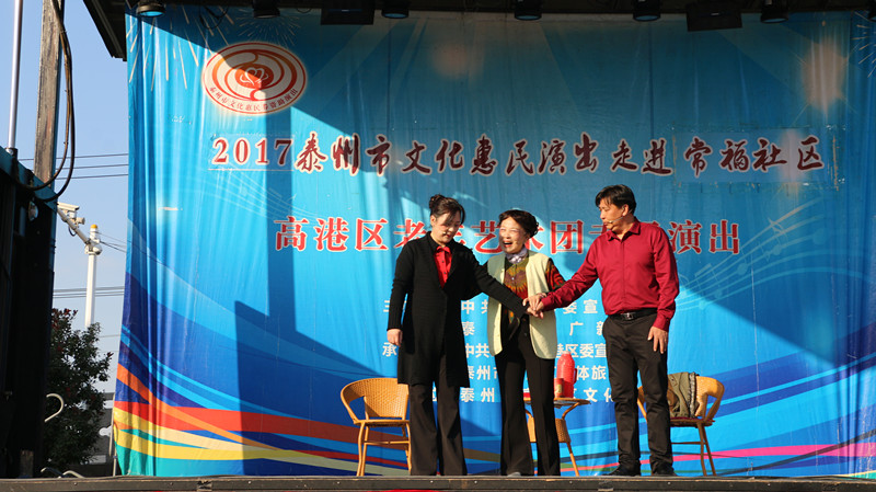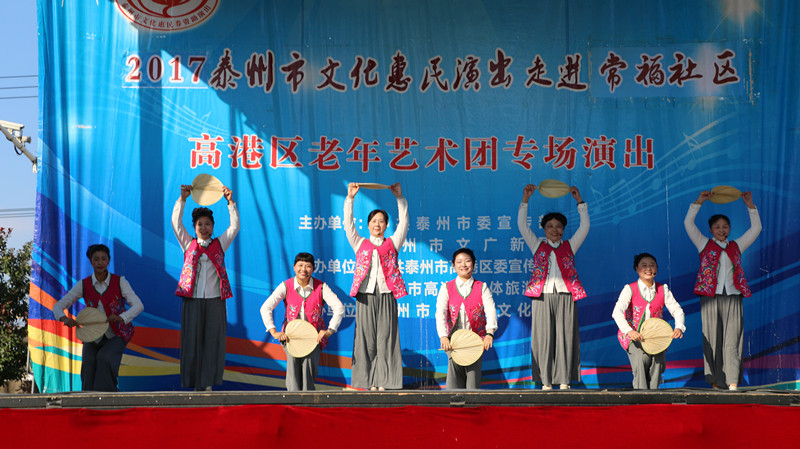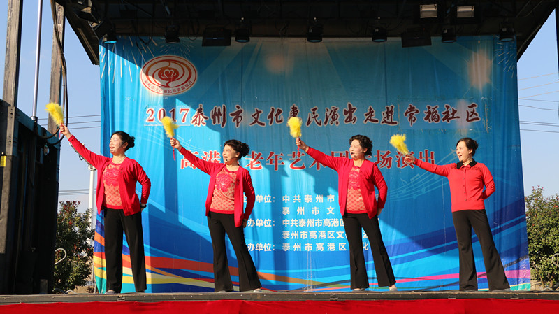 泰州市高港区老年艺术团于2017年11月5日下午走进沿江街道常福社区进行文化惠民演出。演出在幸福家园这美妙的音乐声中拉开了帷幕,采用群众喜闻乐见的表演形式进行,如舞蹈、快板、说唱、小品、