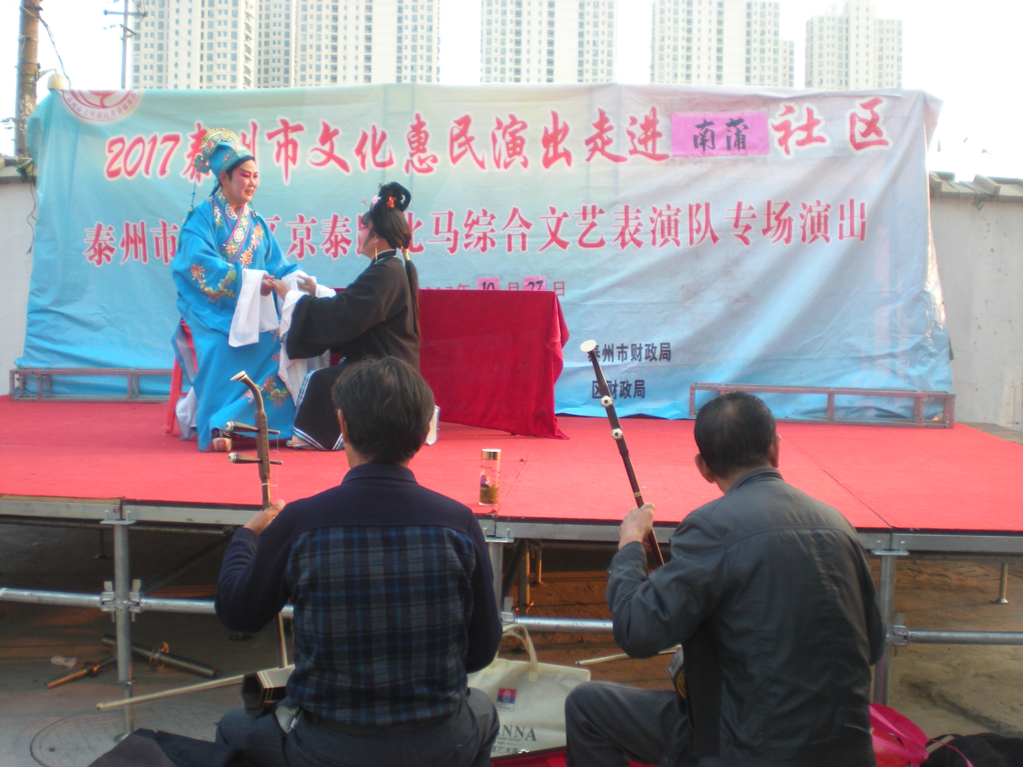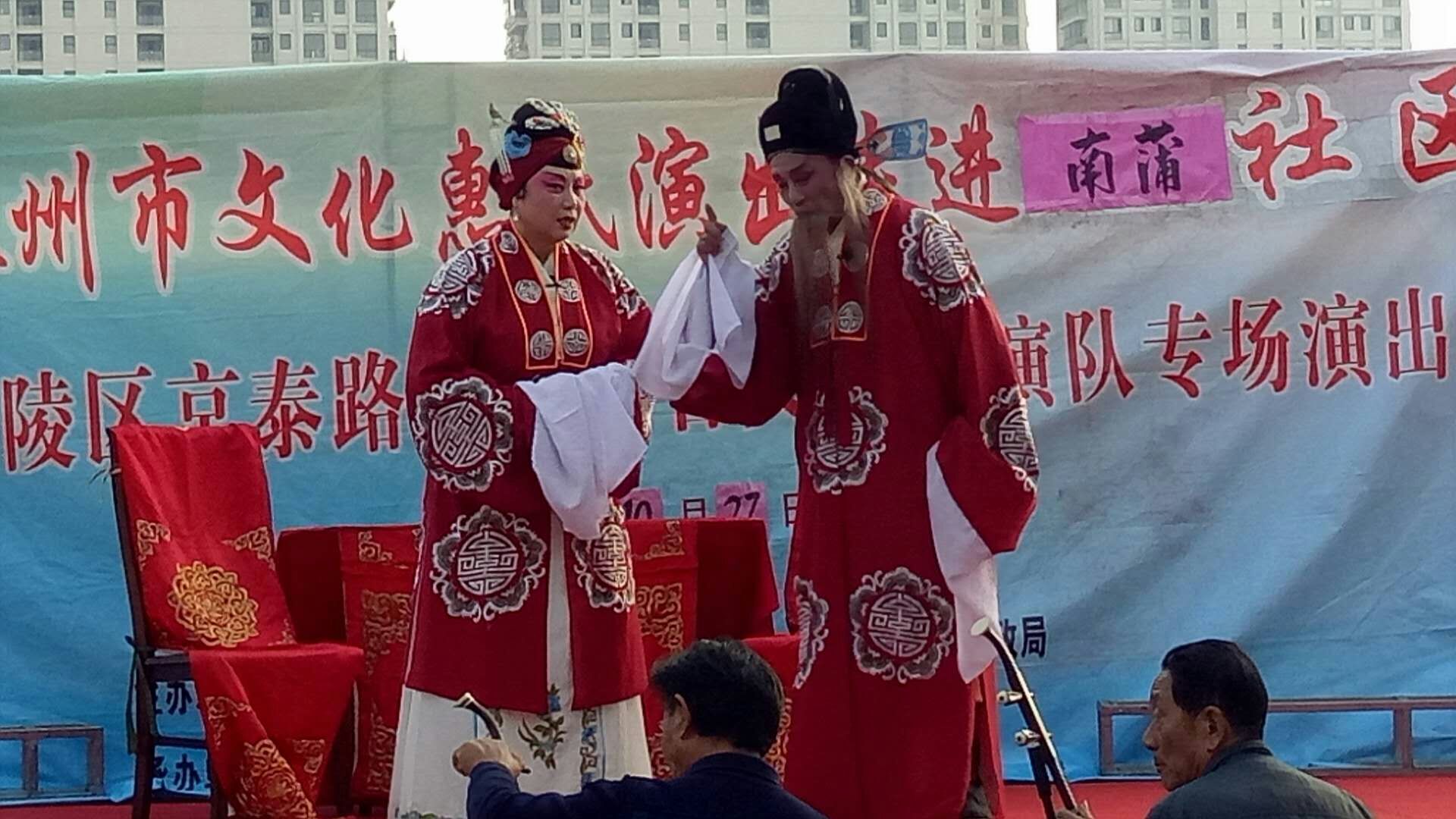 10月27日下午京泰路北马综合文艺表演队走进城中南蒲社区文化广场举办文化惠民演出。这场演出的曲目是扬剧《五女拜寿》,精彩演出和演员们的深厚功底以及精湛的演技赢得了居民们阵阵喝彩,居民们纷纷感慨不已。演出结束后,居民们纷纷表示这样的活动很好,一致认为这样的活动既丰富了文化生活,又宣扬了传统美德,这次戏曲在该社区演出受到居民们的一致好评,社区干部和文化志愿者服务周到,村民们希望惠民演出活动以后多多来社区演出。