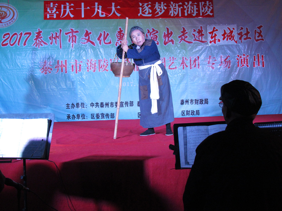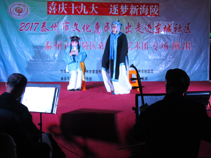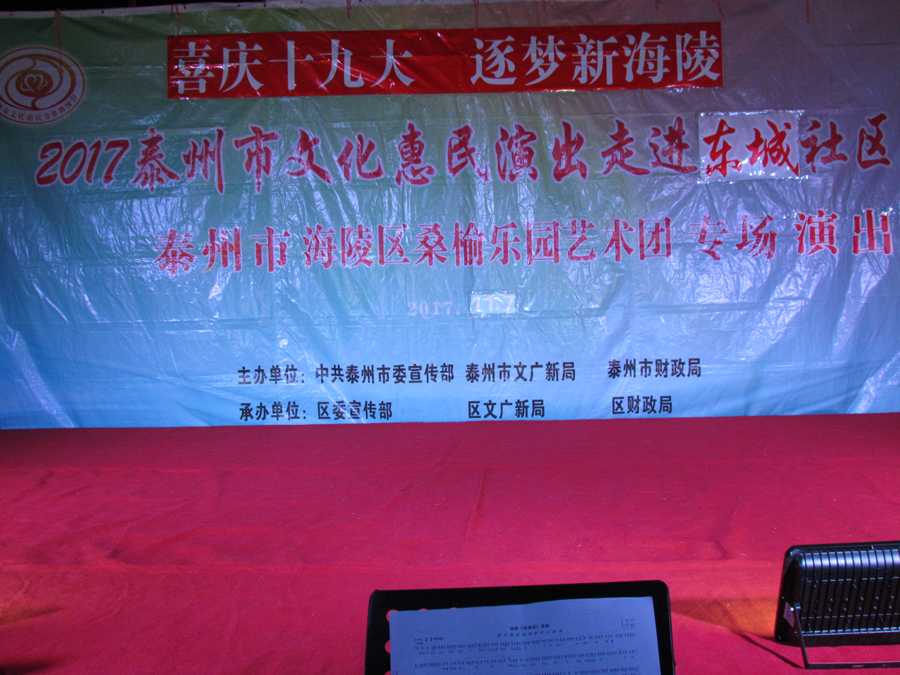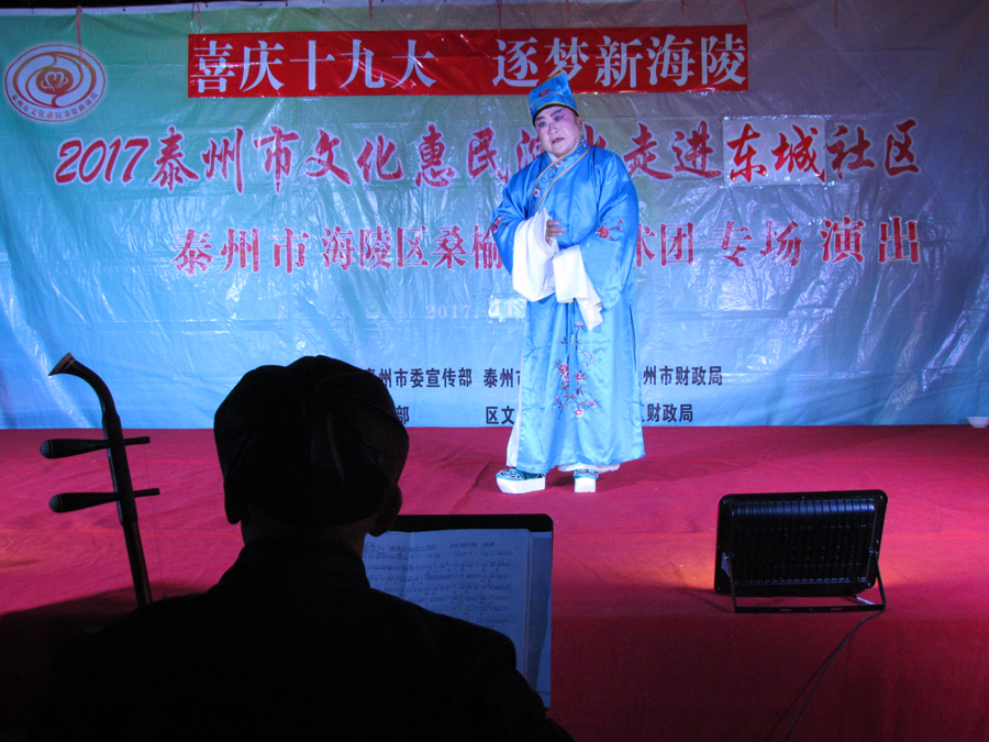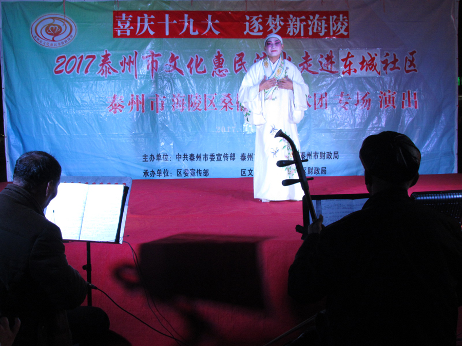 2017年11月7日晚18:30分,多云,初冬时节,气候宜人,在城东街道东城社区世纪联华超市广场,海陵区桑榆乐园艺术团为东城社区的父老乡亲们送去了一台精彩的戏曲专场演出,有淮剧《赵五娘》折子戏选段“别家”,有扬剧《安寿宝卖身》折子戏选段“破庙失子”以及扬淮折子戏选段“十八相送”等,近400名群众对每一个节目都报以热烈的掌声,有的节目演出后,群众还要求再来一段,艺术团都一一满足群众的要求,精彩的演出在东城一带形成了一道亮丽的风景线。