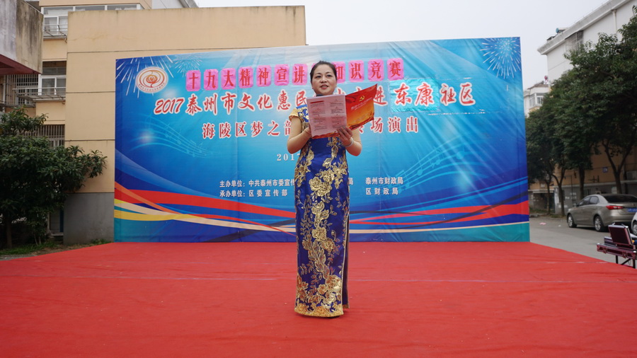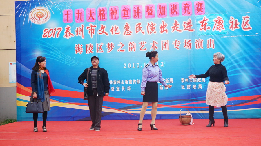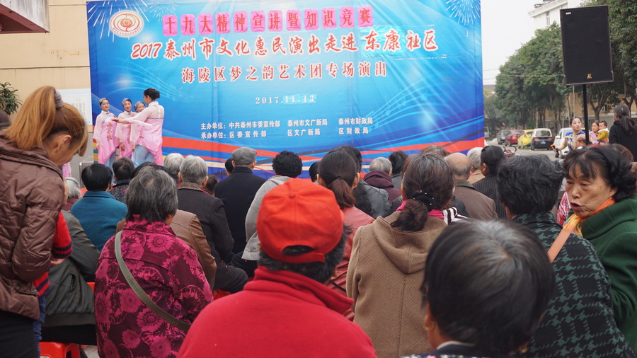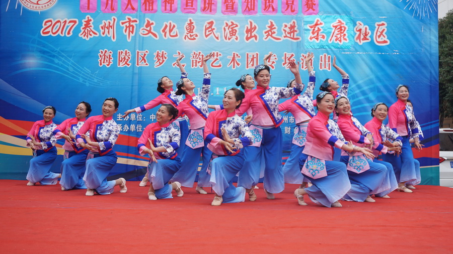 2017年11月13日,梦之韵艺术团应城东街道邀请,赴东康社区进行惠民演出及宣传党的“十九大”精神。当日下午,搭建在东康社区广场上的惠民舞台前早已聚集了不少的观众,舞台背景墙上“十九大精神宣讲及知识竞赛”格外抢眼。据了解,社区干部非常赞赏梦之韵艺术团通过惠民演出的平台上,以老百姓喜闻乐见的“有奖抢答”形式宣传党的“十九大”精神,并广而告之社区居民前来观看演出参加“十九大”知识竞赛活动......。演出节目依然是一如既往的靓丽精彩,知识“抢答”依旧是异乎寻常紧张愉悦,社区丁书记还亲临现场登台为居民宣讲党的“十九大”报告精神.......。梦之韵艺术团着力创新惠民演出宣传平台,在为社区居民带来精彩的视觉盛宴享受的同时,也及时将党的“十九大”精神传递到老百姓之中,着实为惠民演出增彩生辉。