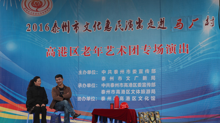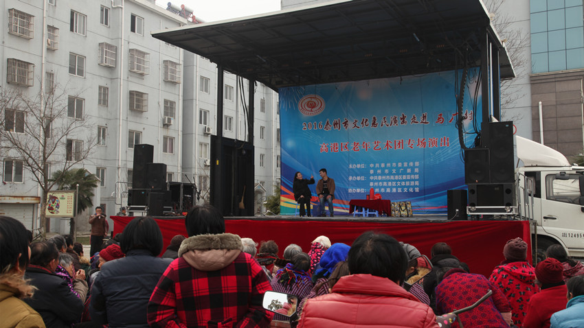 2016年2月23日高港区老年艺术团文化惠民走进许庄马厂社区,老年艺术团专场文艺演出活动在马厂社区文化广场拉开序幕,整场安排了17个节目,演出时长1小时42分,节目类型包括舞蹈、独唱、小品、器乐、情景剧豫剧等,现场观众约1500人,演出效果较好,得到广大群众一致好评!