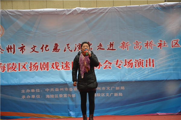2016年2月23日,农历正月十六,海陵区扬剧戏迷网友协会的演员们,和新高桥社区健身队一起为新高桥社区居民带来了一场精彩纷呈的演出盛宴。演员们的唱功深厚,手眼身法引人入胜,健身队的大姐们活力四射,台下的观众们掌声、喝彩声不断。此次演出不光为元宵节增添了喜气,更是受到了社区居民的一致好评。
