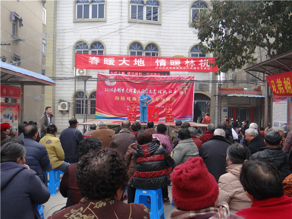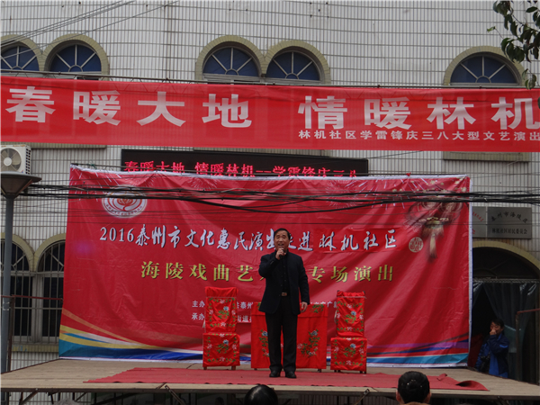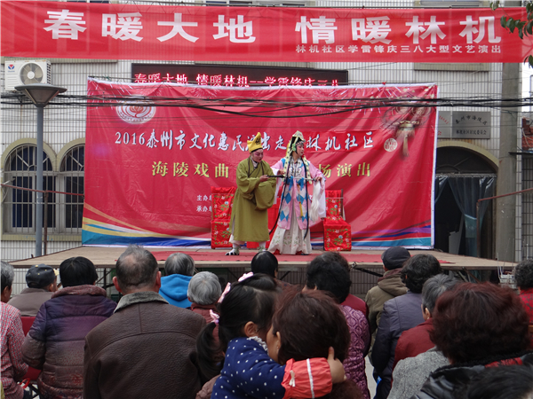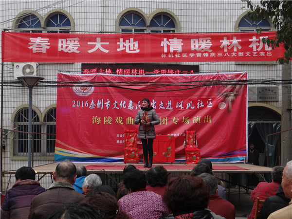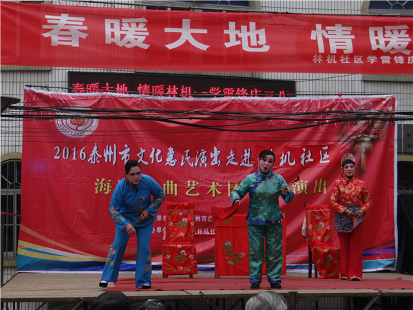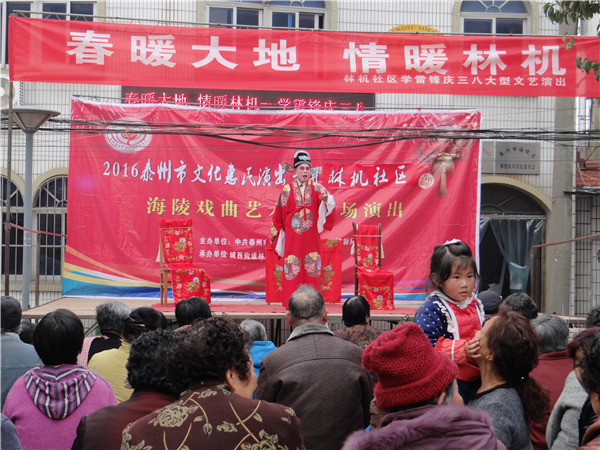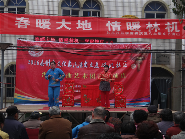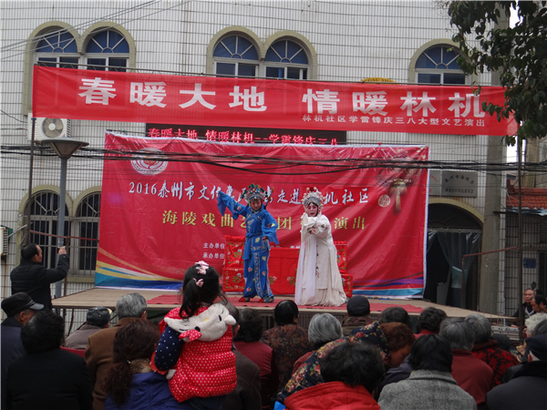 为进一步加强社区文化建设,不断满足社区居民的精神文化需求,营造文明、和谐的社区氛围,3月4日下午,林机社区邀请泰州市海陵戏曲艺术团来社区开展“学雷锋 庆三八”惠民文艺演出活动,为社区的居民们献上了一份贴近生活、贴近群众的戏曲表演。