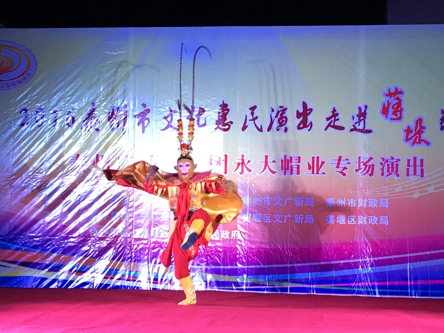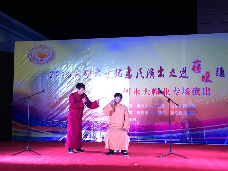 3月9日,寒潮来袭,市区的最低温度只有0度左右,泰州广播艺术团的演员们,走进姜堰区蒋垛镇为坐落在这里的企业永大帽业的干部职工送去了一场精彩的文艺演出,专业、精彩的演出赢得了现场观众的阵阵喝彩。