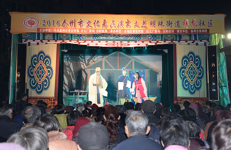 泰州市淮剧团文化惠民演出3月14日、15日两天走进医药高新区明珠街道祥龙社区,给广大的社区居民带来了两台以美德善行为主题的整台优秀传统淮剧,专业、精湛的表演,赢得了数千现场观众的一致好评,虽然夜晚室外的温度较低,但是,丝毫不减观众的欣赏热情。