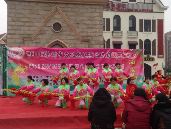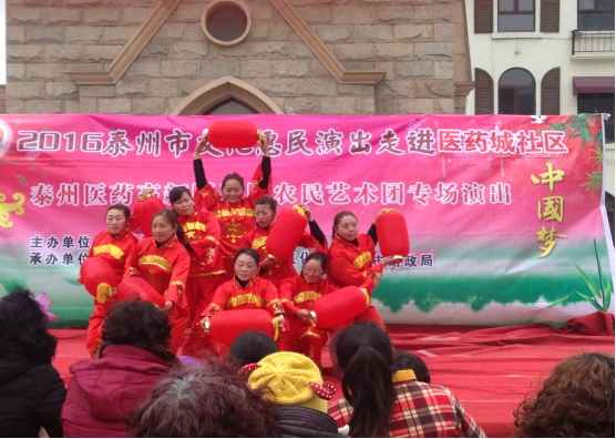 为充分发挥广大群众在文化建设中的主体作用,丰富人们的业余文化生活,积极响应泰州市委、市政府的文化进社区的号召,2016年3月12日下午,寺巷街道医药城社区联合凤凰农民艺术团在东方温莎小镇举办了一场“2016泰州市文化惠民演出走进医药城社区”大型文艺演出。