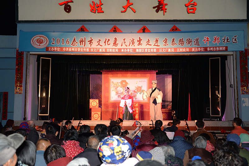 3月25日晚19:00泰州市淮剧团文化惠民演出,全体演职人员,冒着早春的寒风,送戏到海陵区京泰路街道许郑社区,尽管夜晚露天演出是春寒料峭,可是现场观众的热情却是春色盎然,掌声阵阵,好评如潮,散戏了,很多观众久久不愿离去。