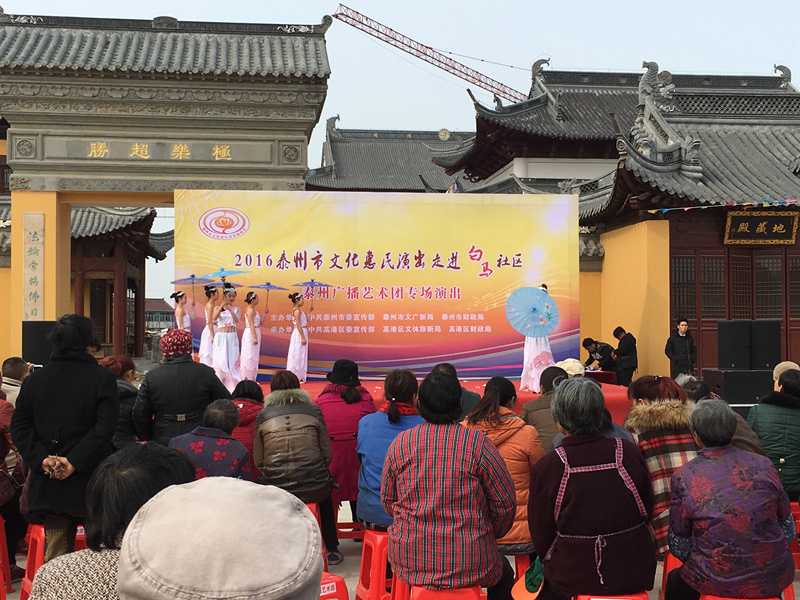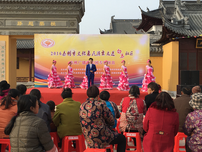 3月23日下午,泰州广播艺术团走进高港区白马镇白马社区,在白马庙广场搭台演出,为居民朋友送上一场精彩的文化节目,吸引了近500多名当地居民和来往行人争相观看。演出中,广播艺术团成员先后表演了舞蹈《桃花扇》、杂技《顶缸》、相声《大双簧》、歌舞《把握你的美》、川剧《变脸》等十多个节目,赢得了在场的观众阵阵掌声。