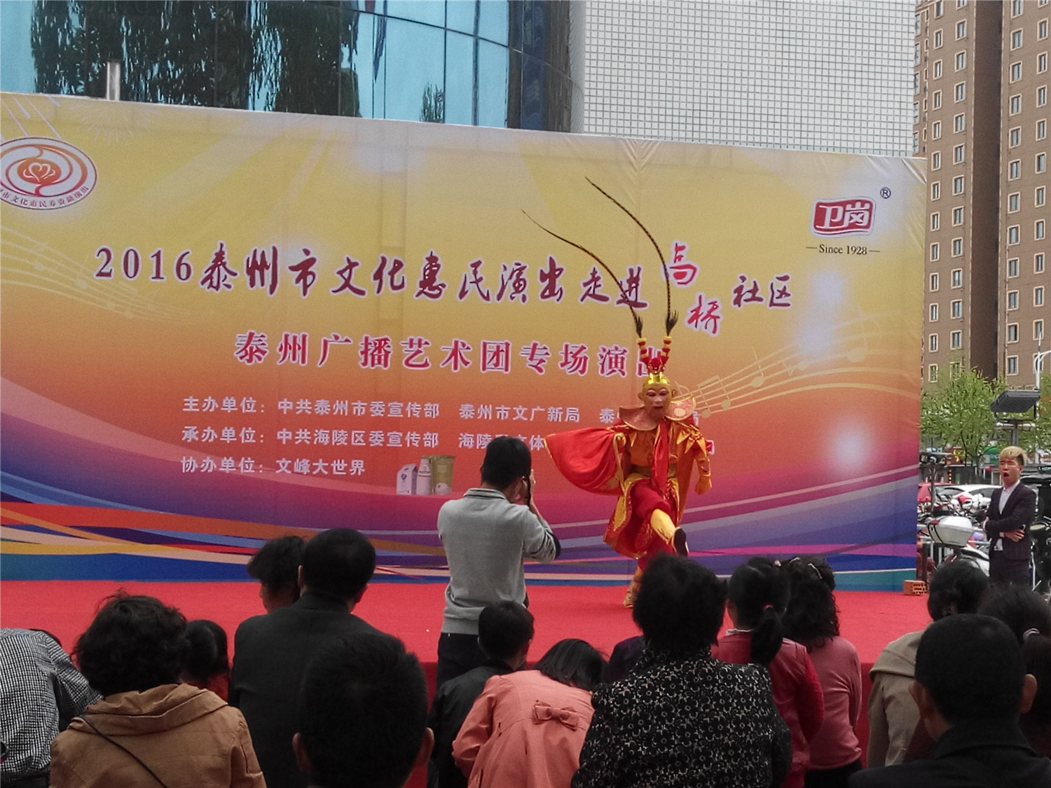 泰州广播艺术团带来了美猴王表演《金猴献瑞》、杂技《顶缸》、歌曲《咱老百姓》、舞蹈《我不是黄蓉》等节目,多样的艺术形式、精彩的表演赢得了居民群众一阵阵的掌声。