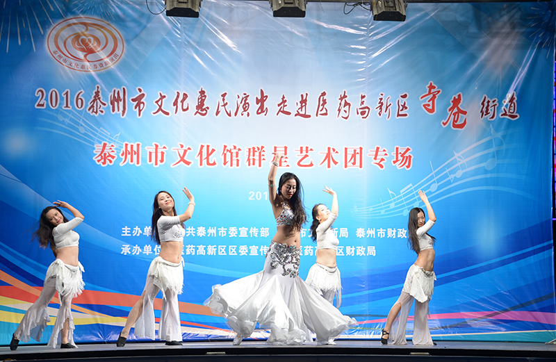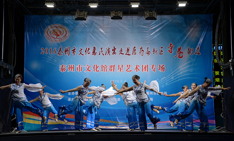 原来是泰州市文化馆群星艺术团将一场文化大宴送到这儿,当地的居民把演出舞台车围了个水泄不通。演出的节目多种多样,有舞蹈《春风里阳光下》、二胡齐奏《光明行》、鼓韵说唱《牢记十要十不要》、小组唱《印象泰州》、小品《相亲相爱一家人》等节目,现场的气氛十分热烈,DCP电声乐队更是在观众的掌声和喝彩中连续演唱了四首歌曲。