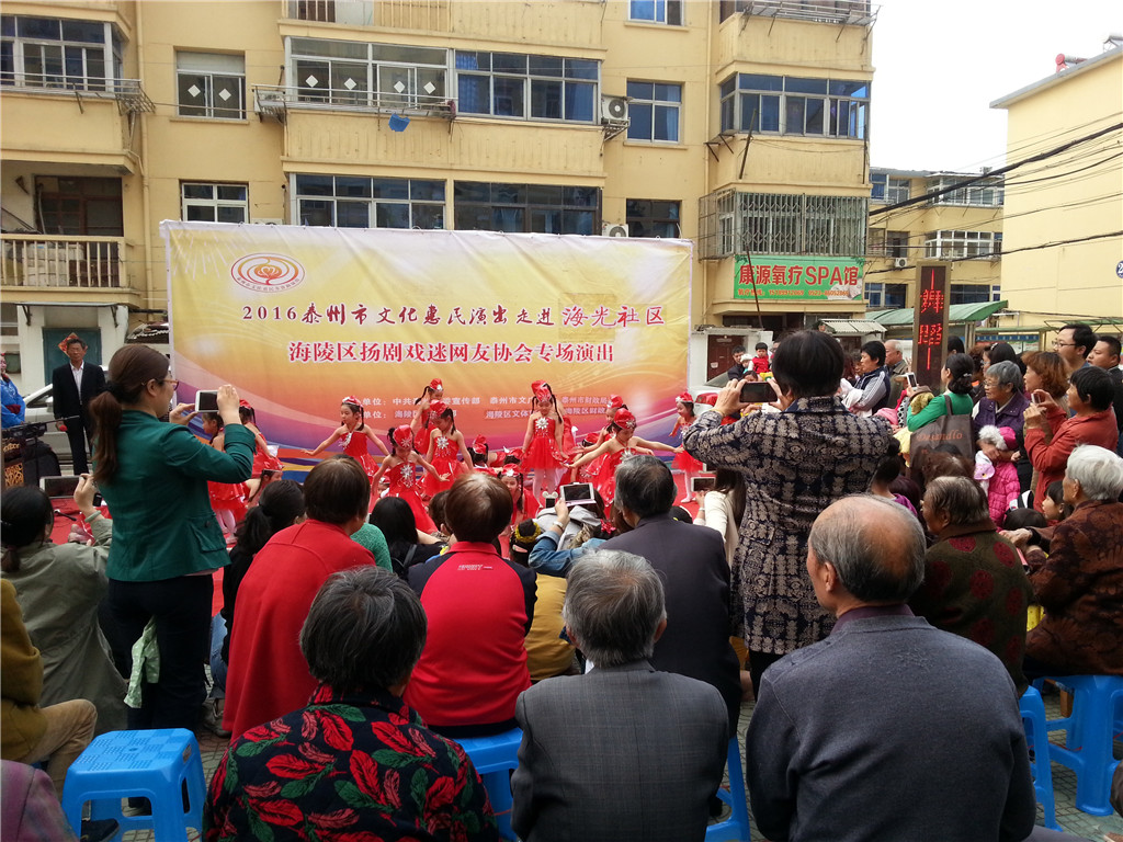 2016年5月7日下午,扬剧戏迷网友协会走进海光社区,为广大的居民朋友们带来了精彩的扬剧表演。扬剧《看灯、挑女婿》、《向朝阳》、《安寿宝卖身》、《梁祝》等经典选段让社区群众不禁拍手称好。同时此次演出正值母亲节前夕,社区的儿童们也为所有的母亲献舞《嘚啵嘚啵嘚》、《鱼儿》,社区的志愿者们说唱表演《四奶奶齐夸居家养老好》、器乐《喜洋洋》等形式多样、内容丰富的节目吸引了广大的居民群众前来观看。演出在观众们热烈的掌声中画上了圆满的句号。大家都表示看的意犹未尽,期待下一次更精彩的表演并希望这样的文化惠民演出能经常深入到基层来,丰富老百姓的业余文化生活。