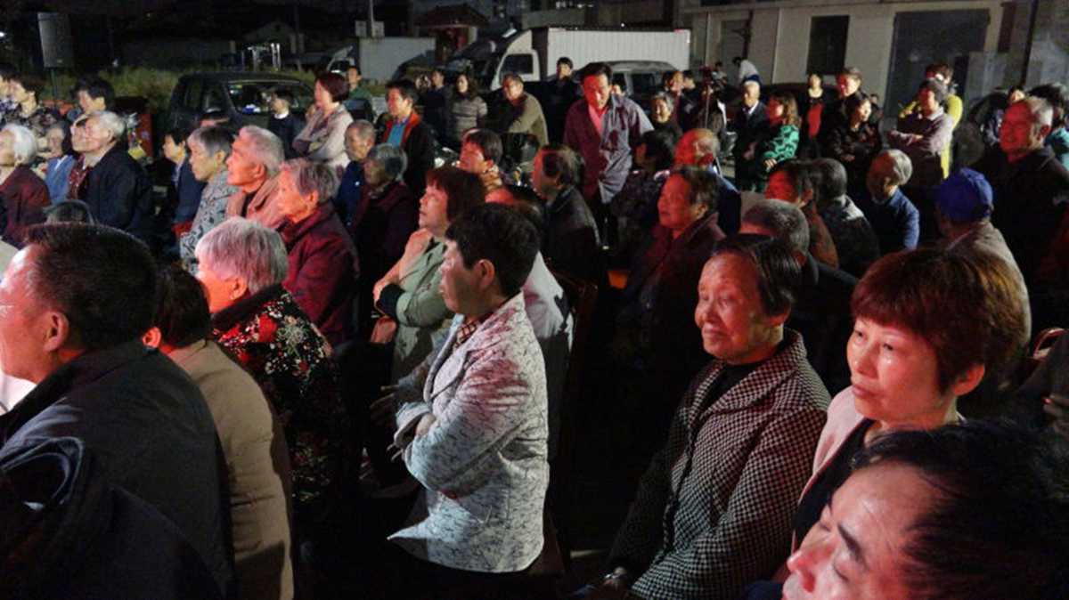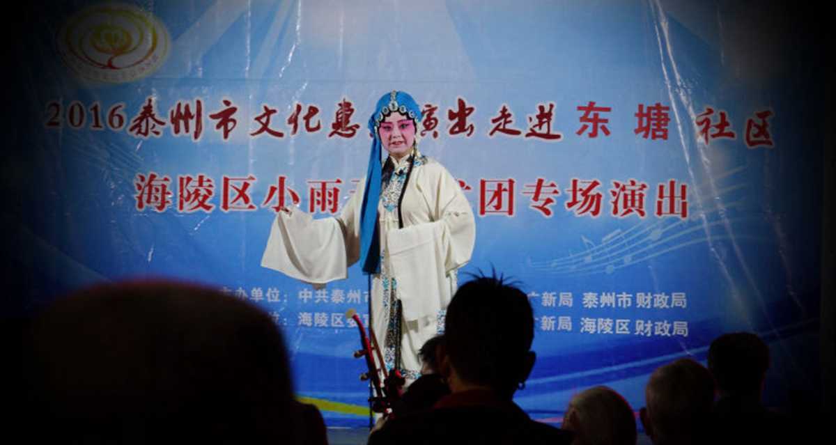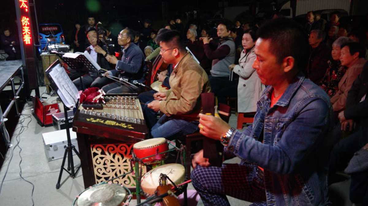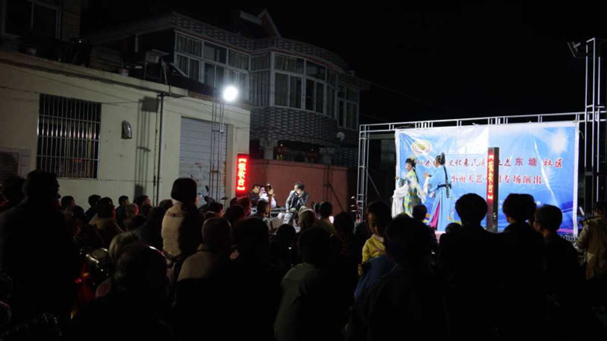 小雨天艺术团为了给村民一个完美的演出,下午三点就开始搭台工作了。钢架结构的舞台配备有台词显示屏,二胡、古筝各种乐器一应俱全,演出还没开始停车场上就站满了看戏的群众。《双下山》、《梳妆台》并清唱了几段戏曲,将群众的热情推上了高潮,直到表演结束大家还沉溺于其中,久久不能自拔。