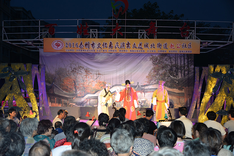 6月17日晚(原定6月3日,由于高考和中考延期)泰州市淮剧团应海陵区城北街道赵公社区的邀请,在森园小区内为广大居民带来了一台传统优秀精品淮剧《珍珠塔》;能够容纳数千观众的广场座满了热情的观众,观众对整台演员人物刻化得立体饱满、基本功扎实、剧情连贯跌宕,连连叫好,称道专业的表演水平高,全剧让居民看了情绪热烈,掌声雷动、久久不愿离去。