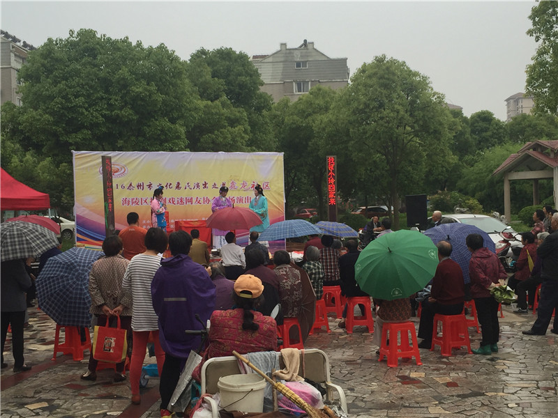 6月2日下午14:30,泰州市文化惠民演出团队“海陵扬剧戏迷网友协会”走进鑫龙社区,为居民们献上了一份贴近生活、贴近群众的戏曲大餐。扬剧《珍珠塔》、《清风亭》、《小媳妇回娘家》、《恩仇记》、《真假新郎》、《恩仇记》等经典选段让小区居民拍手叫好,尤其是凌会长亲自上阵的《玉蜻蜓》选段更是把现象氛围推向了高潮。同时社区文体队也给居民带来了舞蹈《开门红》,丰富的节目吸引了广大居民前来观看。