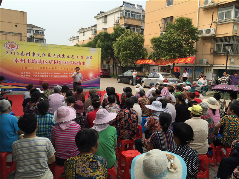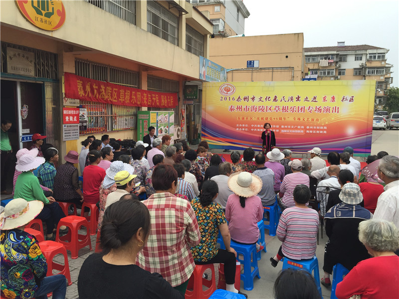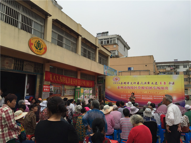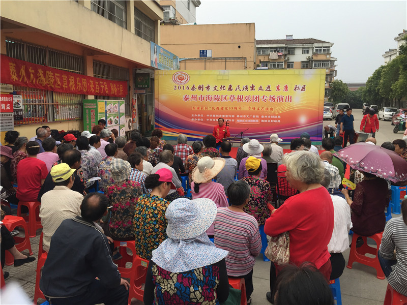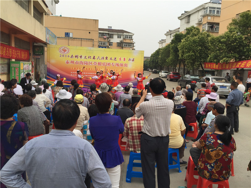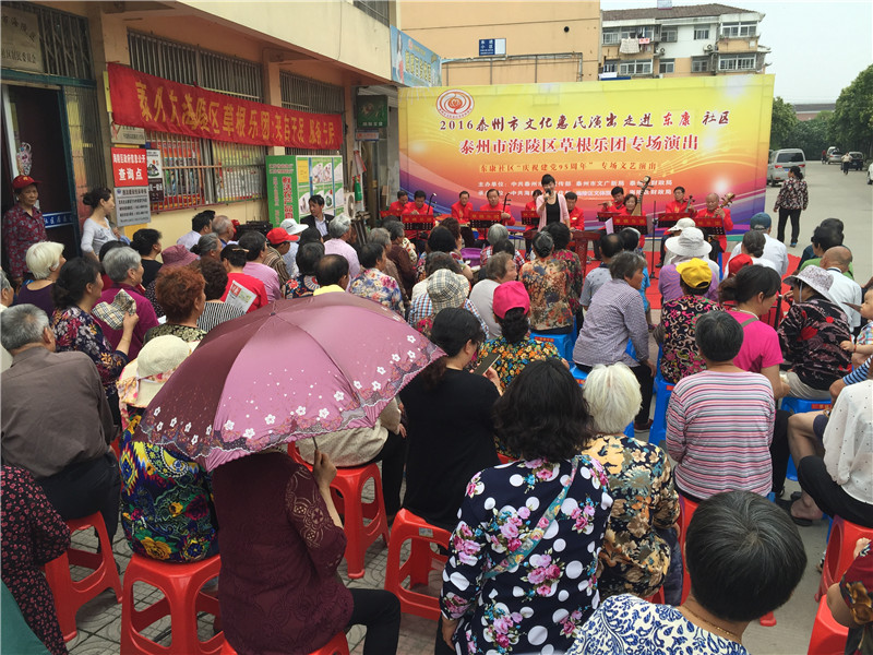 6月13日下午2:30分,海陵区草根乐团走进东康社区开展了迎七一为主题的文化惠民演出,演出在社区门口的广场举行。多名专业演员带来了高水平的演出,表演内容主要有器乐合奏《彩云追月》、男女对唱《我爱你中国》、二胡独奏《化蝶》、淮剧《李三娘选段》、锡剧《沙家浜》、萧独奏、快板还有广场舞等艺术形式。活动一开始就吸引居民纷纷观看演出,不一会聚集100多名辖区群众欣赏的表演,这些艺术家表演的节目个个精彩,引得了现场观众的阵阵掌声。