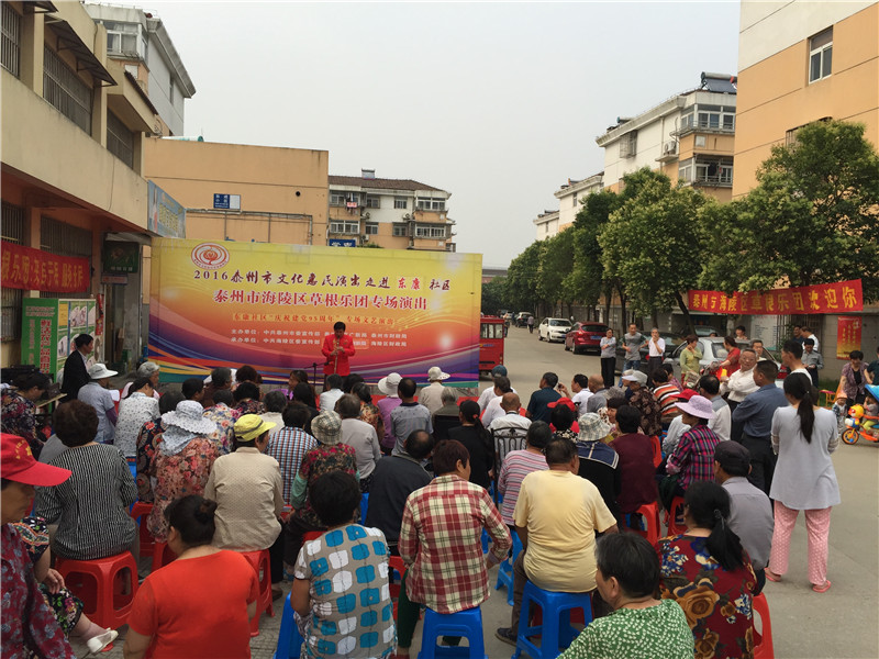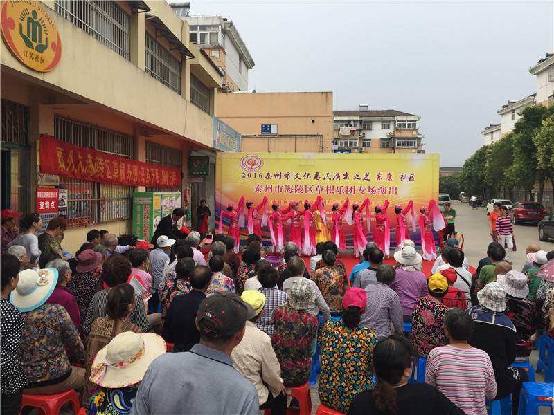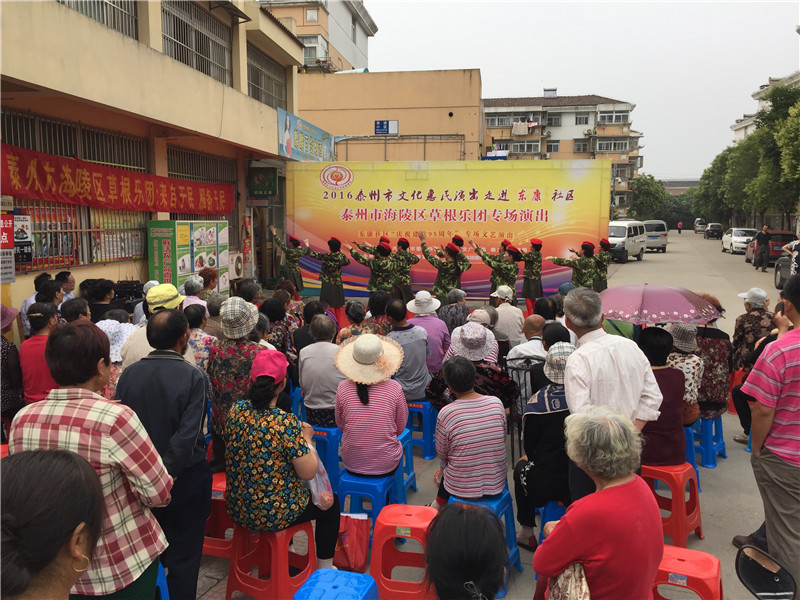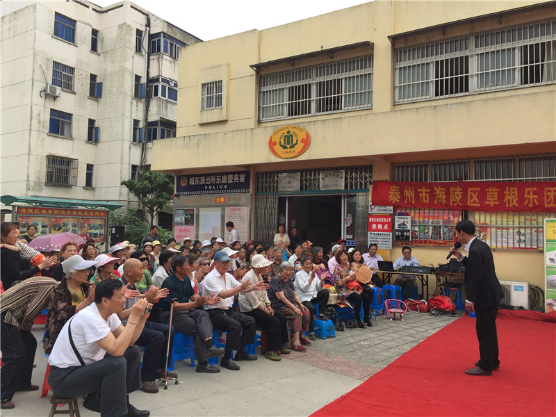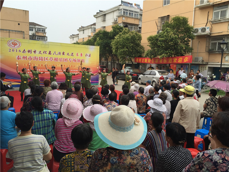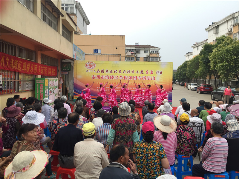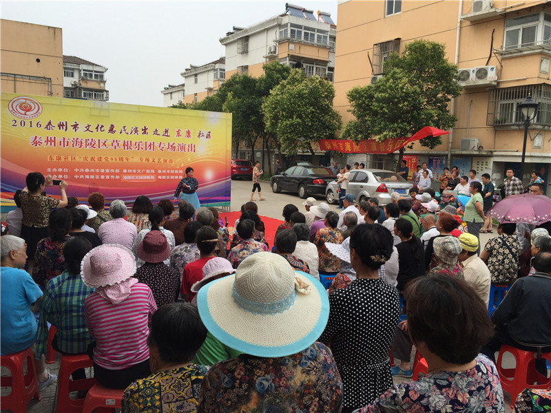 6月13日下午2:30分,海陵区草根乐团走进东康社区开展了迎七一为主题的文化惠民演出,演出在社区门口的广场举行。多名专业演员带来了高水平的演出,表演内容主要有器乐合奏《彩云追月》、男女对唱《我爱你中国》、二胡独奏《化蝶》、淮剧《李三娘选段》、锡剧《沙家浜》、萧独奏、快板还有广场舞等艺术形式。活动一开始就吸引居民纷纷观看演出,不一会聚集100多名辖区群众欣赏的表演,这些艺术家表演的节目个个精彩,引得了现场观众的阵阵掌声。