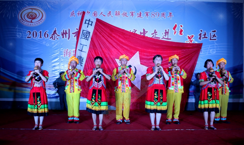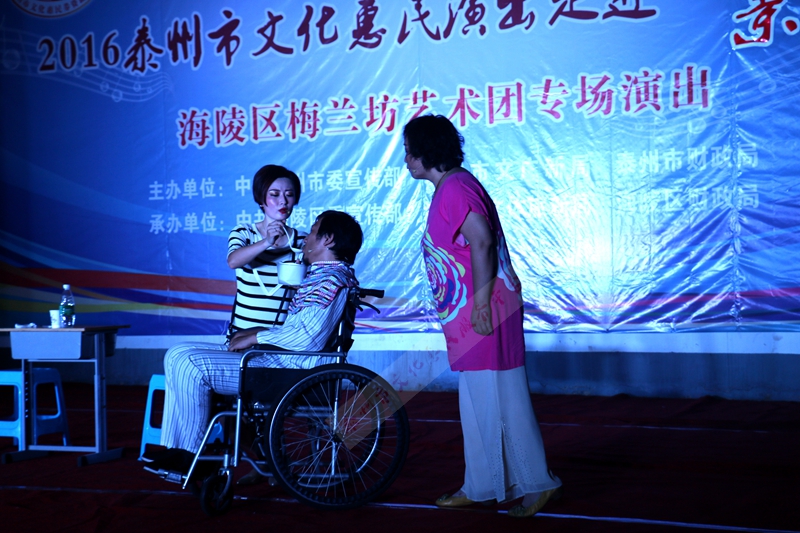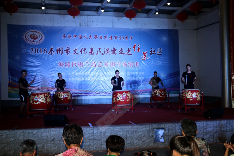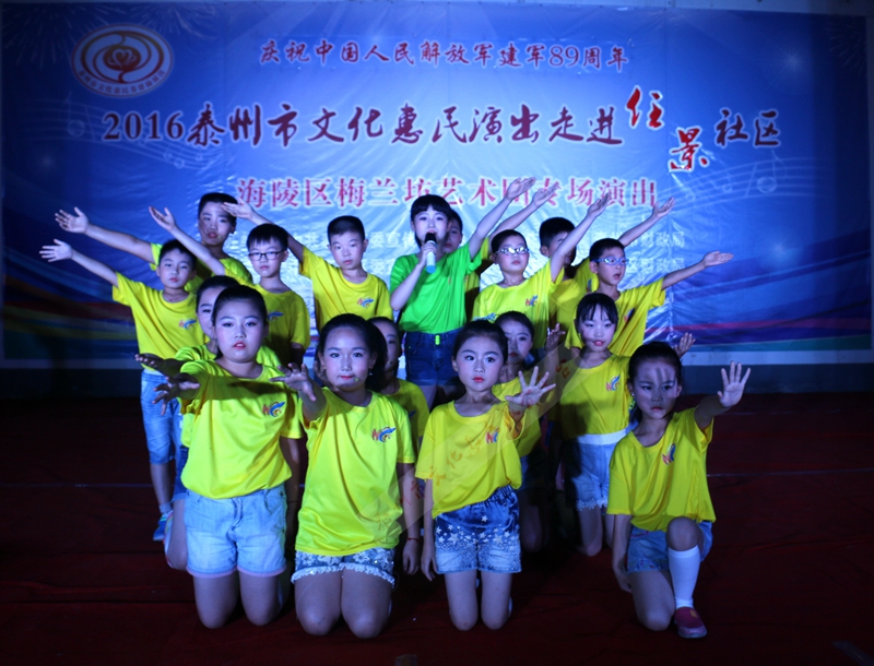 “军爱民民拥军,军民团结一家亲” 七月三十日晚上七点四十五分,庆祝中国人民解放军建军89周年暨泰州文化惠民券资助演出海陵区梅兰坊艺术团专场走进任景。演出在隆隆的大鼓声中开幕,紧接着歌舞、器乐、舞蹈、音乐快板、,小品、女声独唱、男声独唱、戏曲、童声小合唱、三句半等形式多样、内容丰富的节目纷纷登场。赢得了观众的阵阵掌声和叫好声。