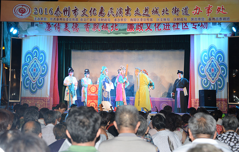 8月19日晚7:30分应海陵区城北街道办事处的邀请,泰州市淮剧团文化惠民演出走进城北街道滨河广场,为观众带来了一台优秀淮剧《唐知县审诰命》,虽然天气炎热但是丝毫没有影响观众的欣赏热情,演员们精湛的演技赢得了广大观众阵阵掌声,戏迷张先生说:“专业剧团表演水准就是高,欢迎你们团常来演出”。