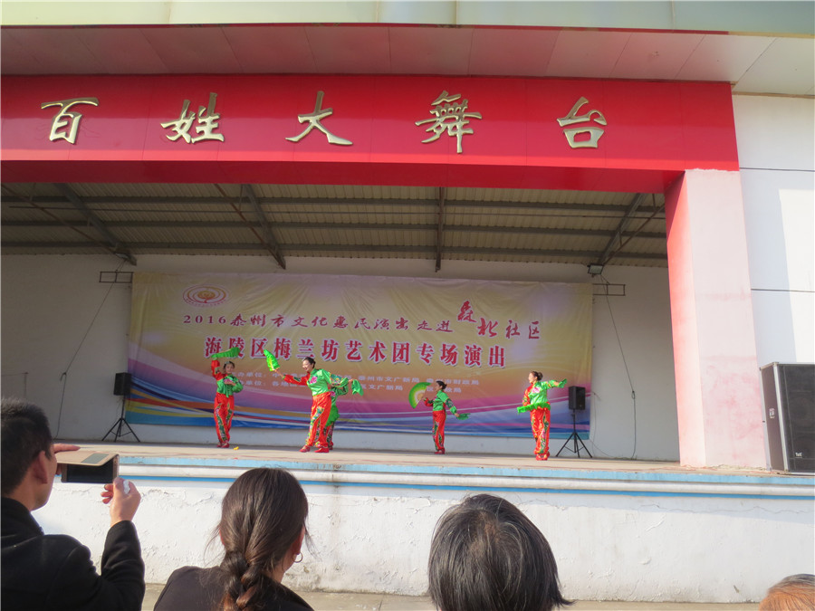 演出以舞蹈《中国梦》开场,整场演出青春活力、精彩纷呈,有独唱、戏剧、舞蹈、小品、三句半等,吸引了众多居民前来观看,台上精彩不断,台下掌声阵阵,丰富的节目将文艺演出推上了一个又一个高潮,表演在歌伴舞《好运来》圆满地落下帷幕,给在场的观众带来了一场别开生面的视觉和文化盛宴,大家在欣赏精彩节目的同时,更收获了一份浓浓的文化祝福。现场的群众个个都感叹如今农村的精神文化生活丰富了,表演走进社区,走进居民,居民们可以足不出户看到如此精彩的文艺演出,受到了居民们的热情欢迎。