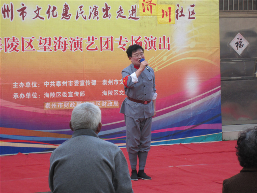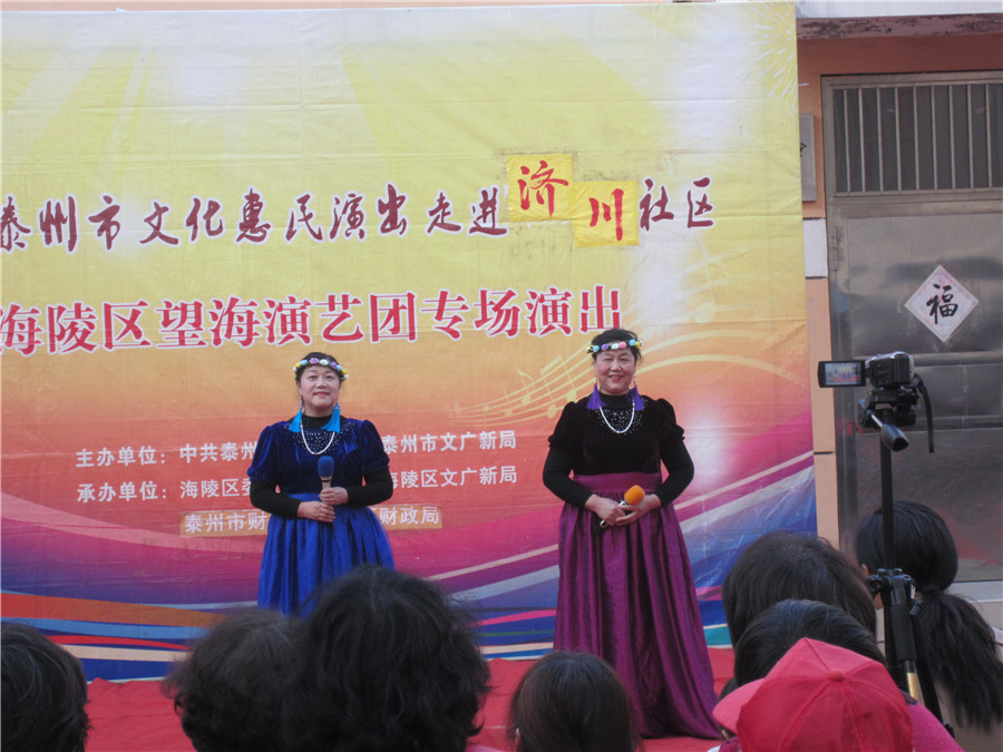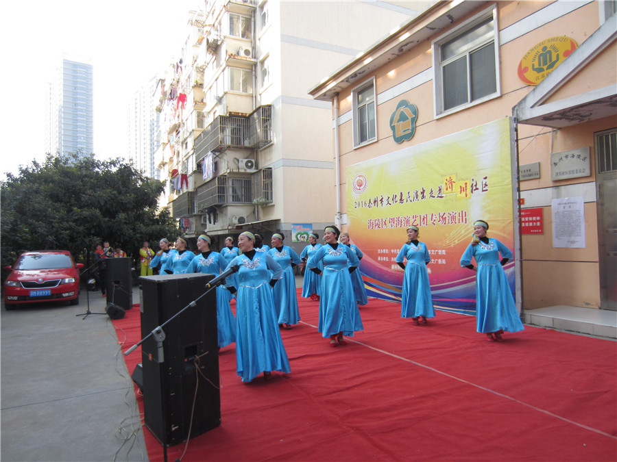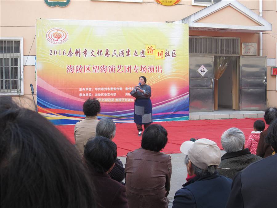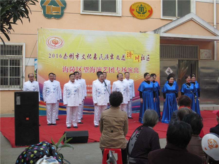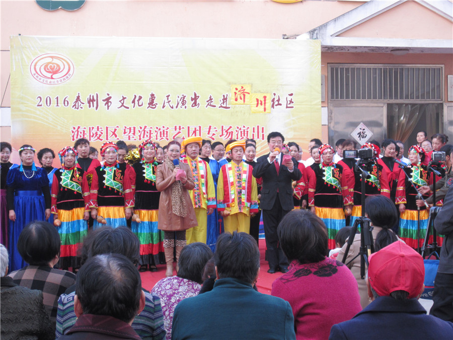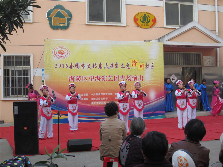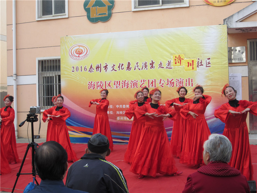 11月4日下午,海陵区望海艺术团走进济川社区,为居民们奉献了一场文化视觉盛宴。下午两点,居民们早早来到现场,伴随着舞蹈《中国梦》优美的音乐声,文化惠民演出正式拉开帷幕。现场演员们为大家表演了舞蹈《想西藏》、小品《可怜天下儿女心》、葫芦丝演奏《龙船调》、大合唱《走向复兴》等精彩绝伦的艺术作品,充分展示了扎实专业的表演功底和诙谐幽默的表演风格。获得了居民们热烈的掌声和欢呼声。
