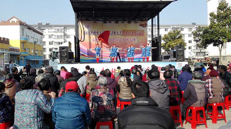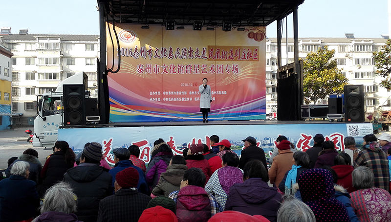 12月17日下午,泰州市文化馆文化惠民演出走进凤凰街道刘庄社区,为当地群众带了一场精彩的文化大餐。舞蹈《五星红旗飘起来》拉开了演出的序幕,一曲二胡独奏把观众带入到战马嘶鸣、风驰电掣、冲锋陷阵、顽强格斗的艺术情景之中,紧接着鼓韵说唱《牢记十要十不要》用通俗的语言讲述着一个文明市民的准则,顶缸表演精湛的表演更是让观众叹为观止,接着还有深受观众喜爱的京剧、淮剧以及魔术表演等节目,形式多种多样,最后在绚丽多彩的歌舞《盛世中国美》落下演出的帷幕。