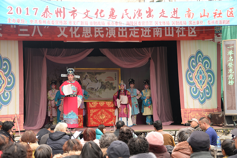 3月4日泰州市淮剧团应海陵区城中街道南山社区的邀请,文化惠民演出活动走进了南山社区鸿发小区广场,为广大的居民带来了一台我团保留经典淮剧《腊月雷》。两个多小时精彩的表演赢得了广大观众数十次掌声,证明此剧是受到观众欢迎的、是接地气的,习总书记在文艺工作座谈会上的讲话精神要求我们文艺工作者在创作上不能迷失方向,要多创作人民群众喜欢的作品;观众认可的作品才是接地气的好作品,今后我们加强新剧目的创作,继续扎根基层为百姓服务。