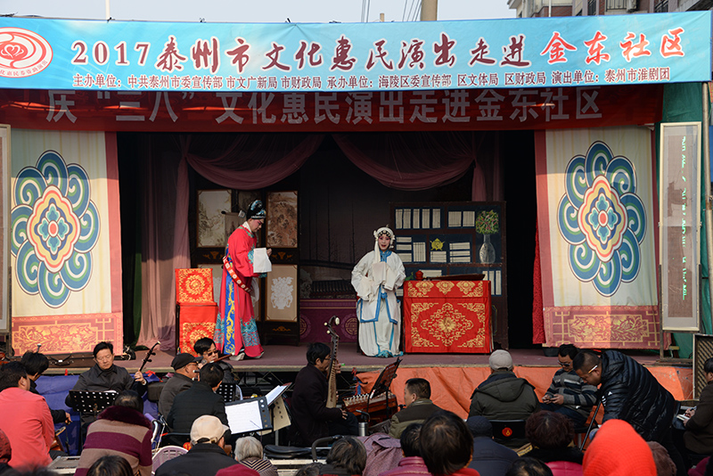 泰州市淮剧团3月6日应海陵区京泰路街道办事处金东社区的邀请,文化惠民演出活动走进了民兴中学南门广场;为社区居民带来了一台经典淮剧《赵五娘》,严谨的团风和过硬的演出质量赢得了现场数千观众阵阵掌声,扎实的唱功和专业的演技给观众留下了深刻的印象,两个半小时的演出对全团演职人员一丝不苟的工作作风也大加赞赏,我们将把这优良传统继承发扬光大。