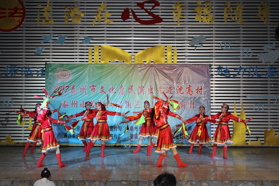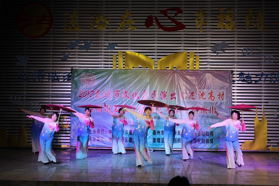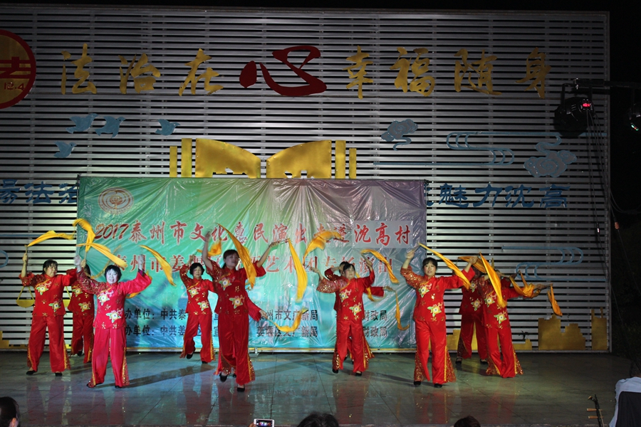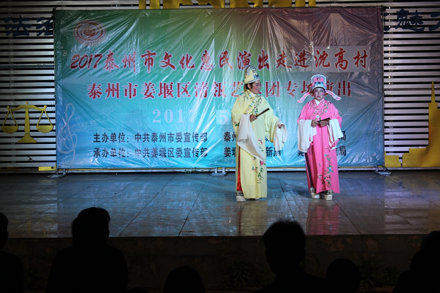 5月22日,姜堰区清瓴艺术团惠民演出走进沈高镇沈高村。舞蹈《走进新农村》拉开了演出的序幕,越剧小戏剧《十八相送》、《夫妻观灯》赢得了观众热烈的掌声,小品《上代做给下代看》让广大观众得到深刻的启发教育,演出在舞蹈《张灯结彩》中结束。整场演出两个多小时,受到了观众一致好评。