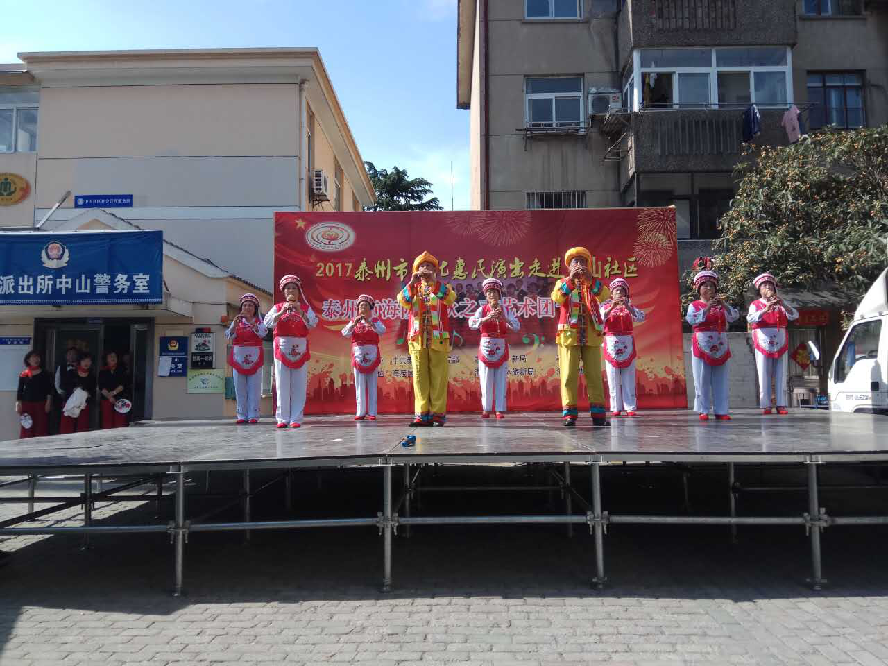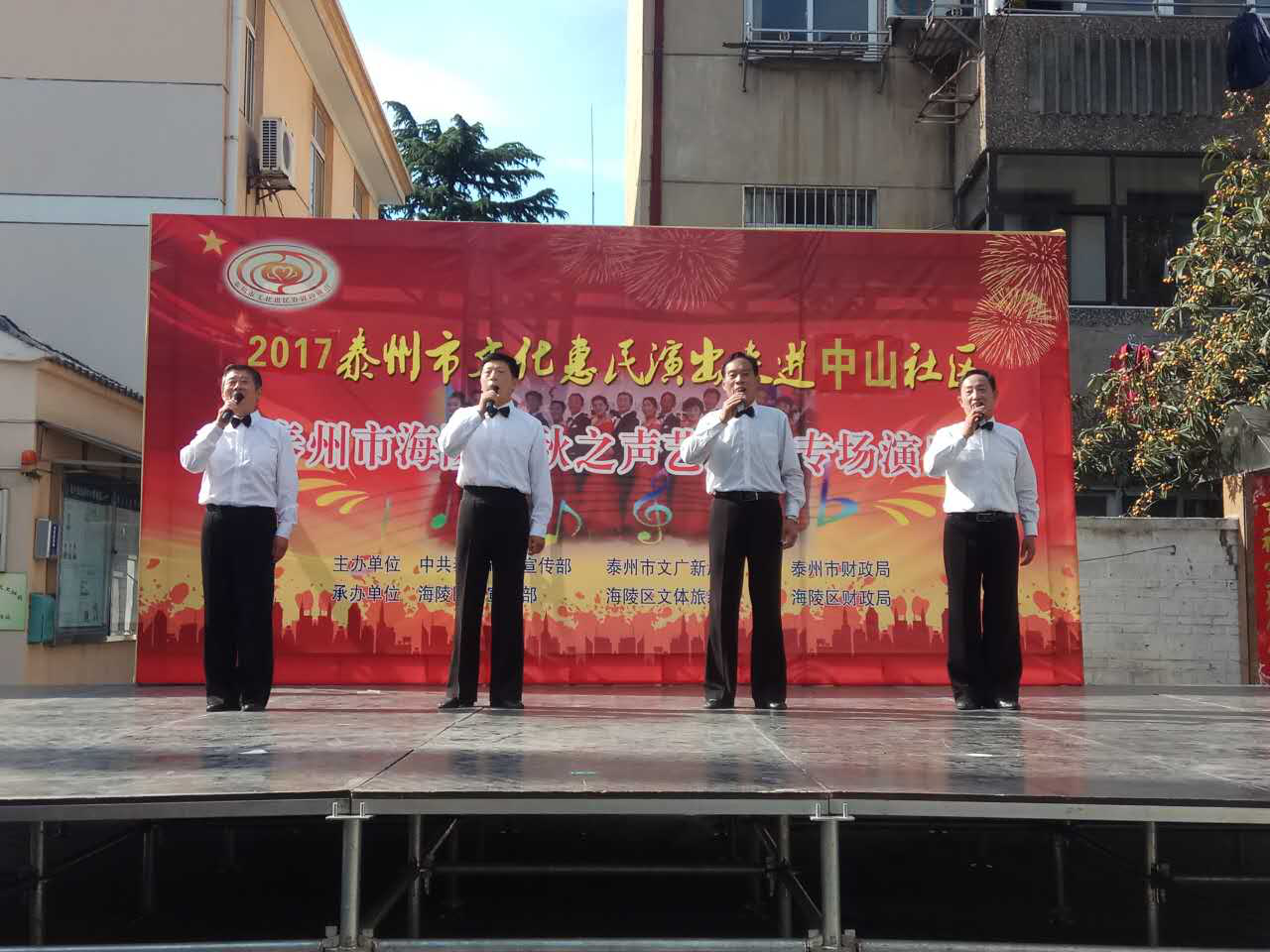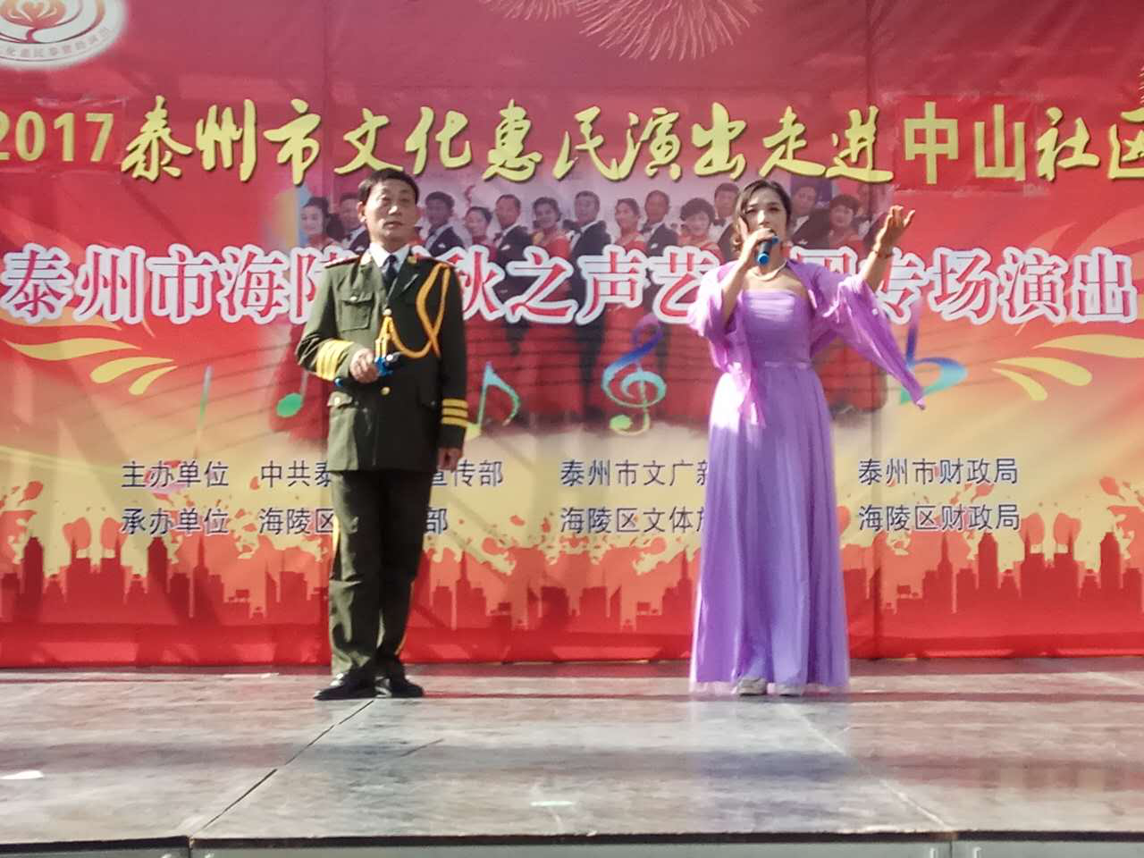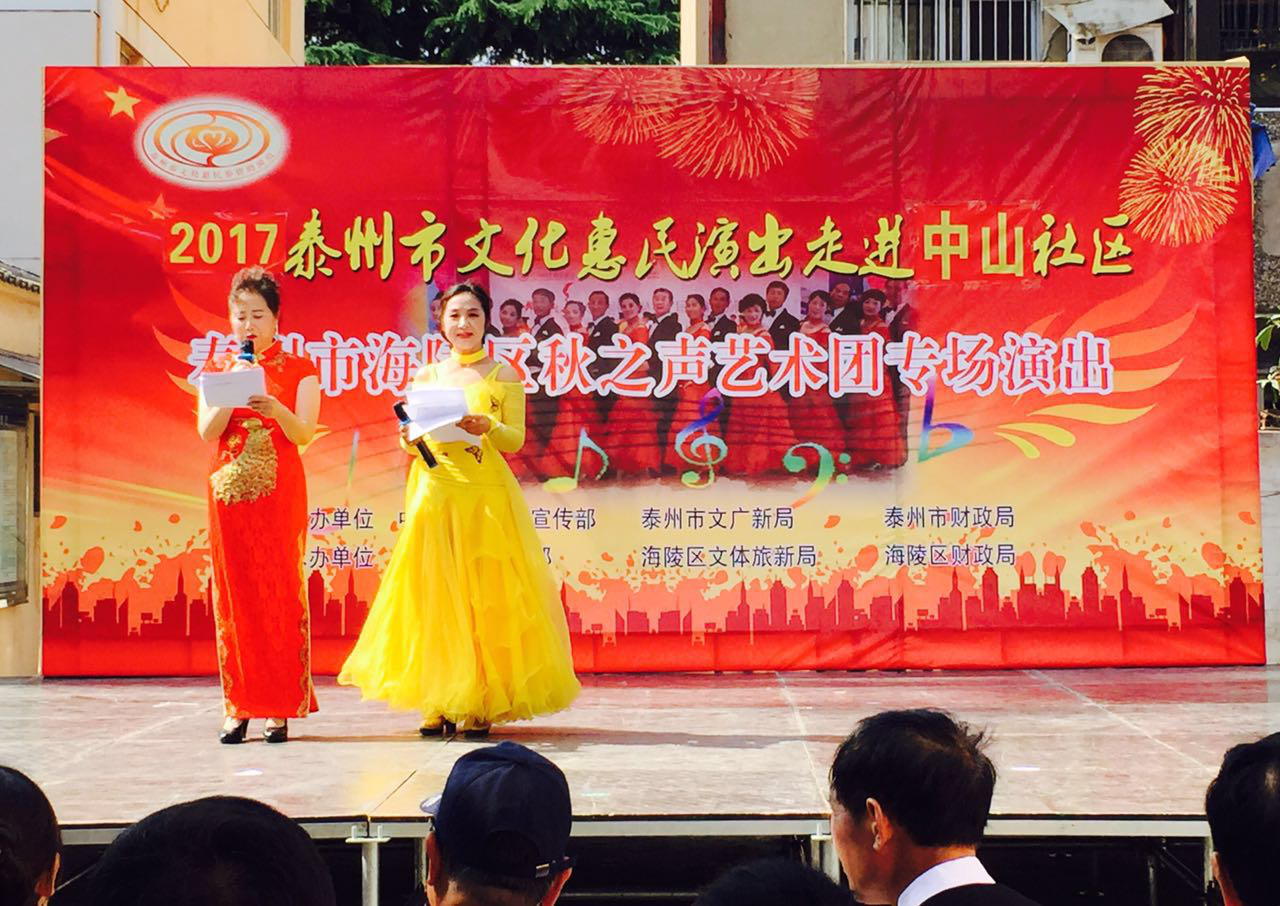 泰州市海陵区秋之声艺术团走进中山社区文化惠民演出。上午八点半午台音响工作人员进场搭建。午台9米乘8米。2017年5月25日下午三时准时在中山社区大楼门前广场进行。艺术团演员45人,观众100人,现场气氛热烈,掌声不断。艺术团主要节目午蹈美丽中国梦、模特走秀青春飞扬、男生四重唱少林少林、葫芦丝表演映山红、独午前门情思大碗茶等16个节目。受到现场观众和社区领导的一致好评。