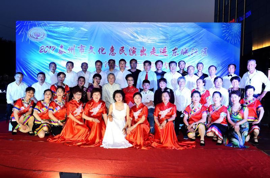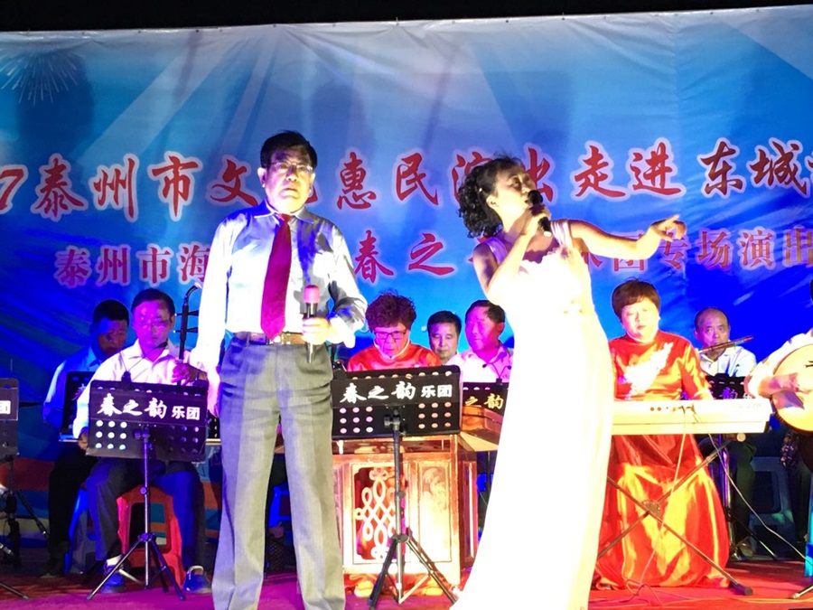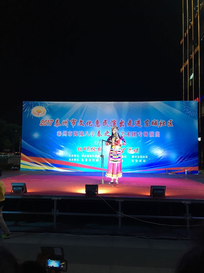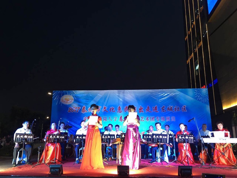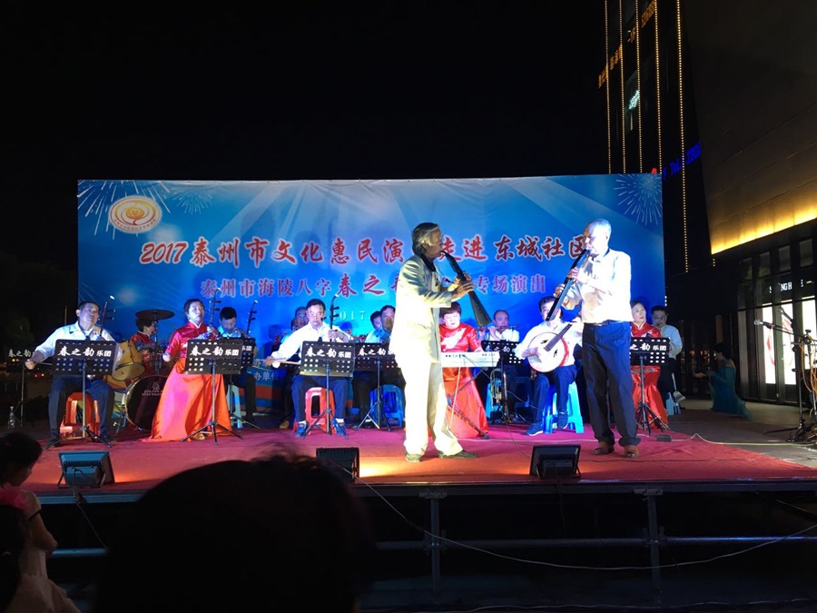 海陵区八字春之韵艺术团走进东城社区,5月27日傍晚,海陵区八字春之韵艺术团在海陵商业中心茂业天地南广场,首场惠民演出。七时三十分准时开场,二十人的乐队,中西合璧,奏出江南丝竹的优美和电声管乐的气势。三十余名演员,最小十一岁,年长者七十七岁,近二百名观众欣赏了器乐合奏,独奏,歌曲,戏曲和午蹈,表演者充分展示才气,观众兴高彩烈。有观众说,惠民演出我看了不少,像这样有水平的不多,社区满意,观众叫好,演员心慰。良好的开端予示着更好的未來。最后,全场互动高歌(我们走在大路上),整台表演100分钟,在欢呼和掌声中结束。
