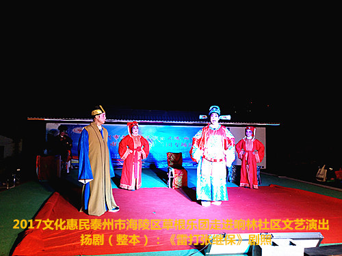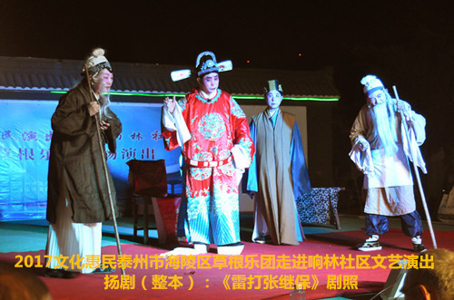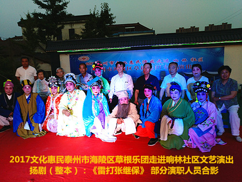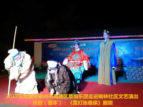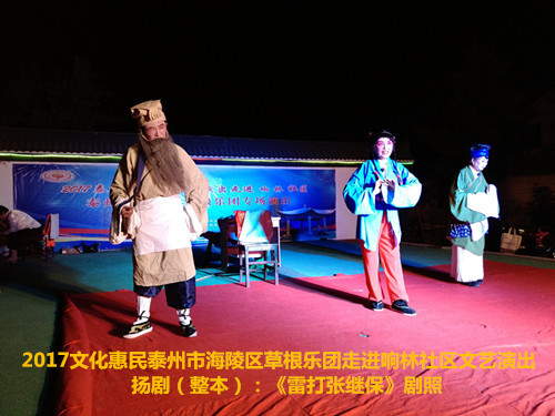 2017年6月2日晚6点半泰州市海陵区草根乐团在团长邰荣的带领下走进京泰路街道响林社区文化惠民演出,今天草根乐团给社区的居民朋友们带来了整本扬剧《雷打张继保》,演出时间整整三个小时,该剧情节跌宕起伏,喜怒哀乐情感丰富,演员舞台上精彩的表演赢得了观众一阵阵掌声,直到演出结束后还有许多观众沉浸在剧情之中,精彩的演出获得了社区居民群众的好评。