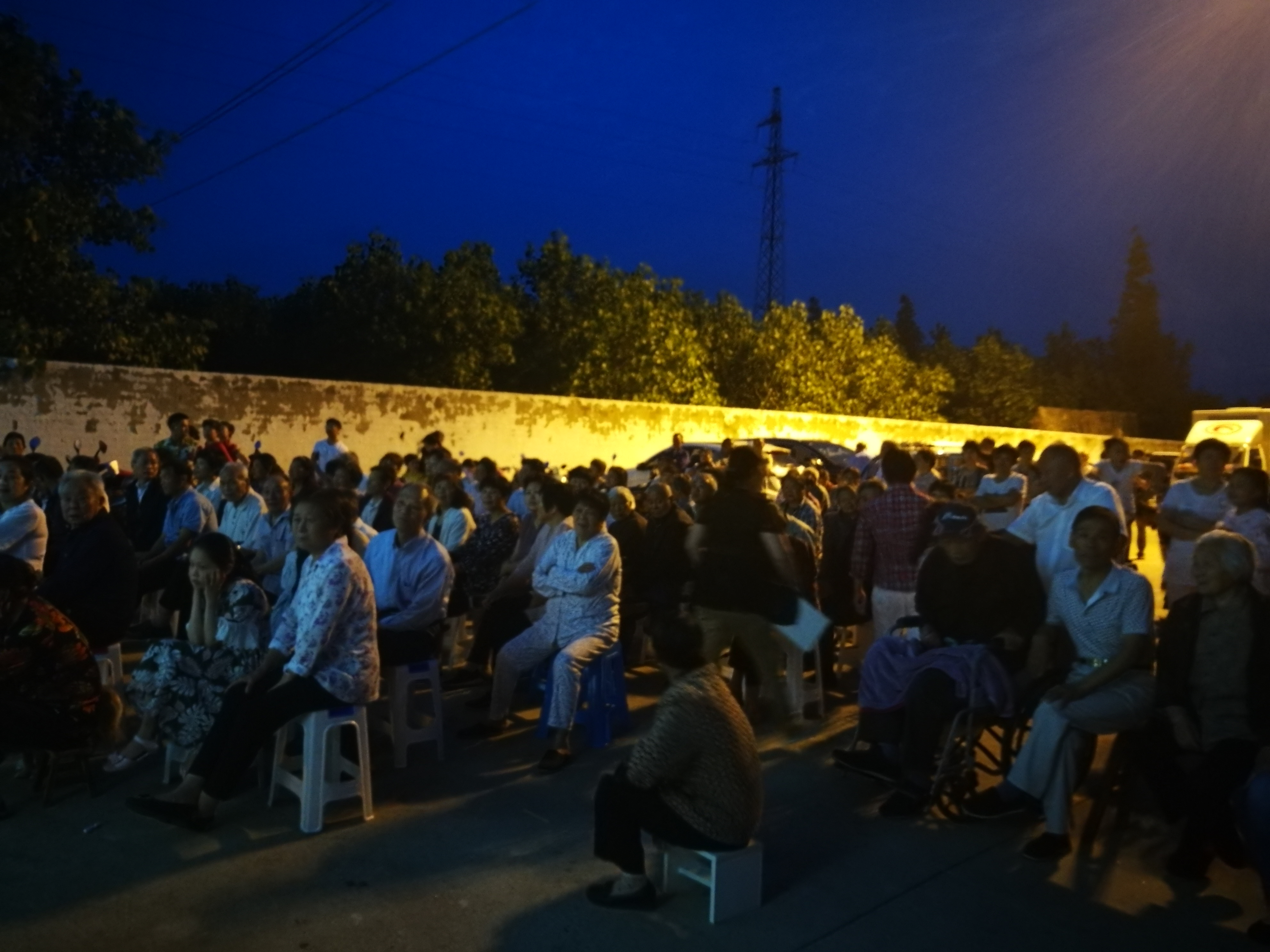 往年常以古装戏团来演出.今是歌舞表演.到场的村民数倍多与往年.在百来张坐凳不够时.自带坐椅的已是随处可见。