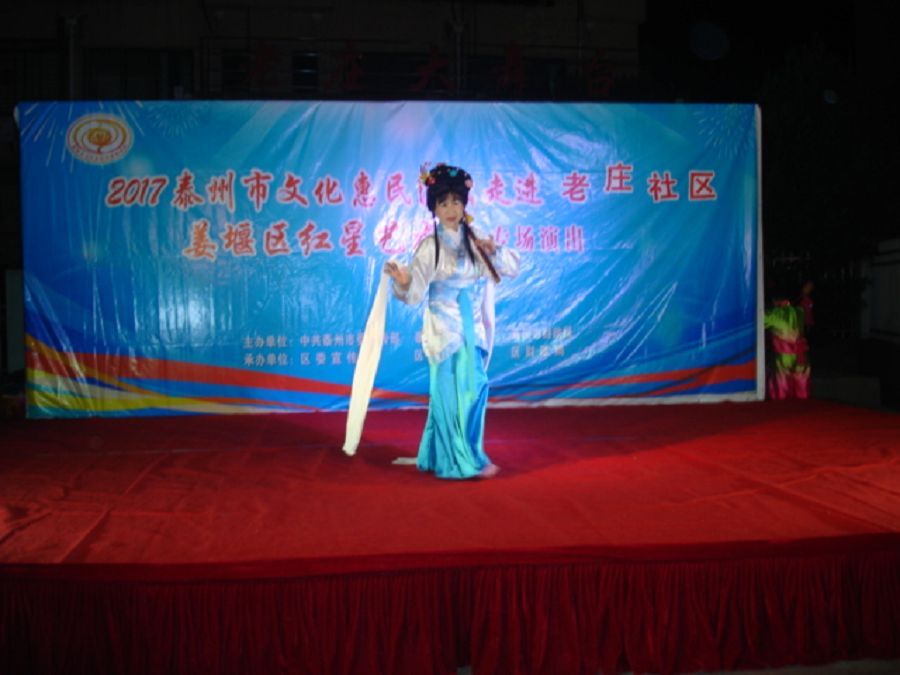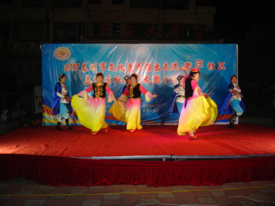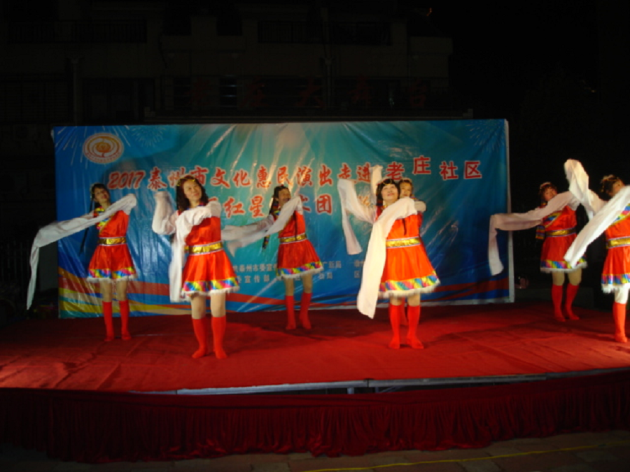 红星艺术团在老庄社区演出受到老庄社区观众们热情接待,在舞台金光闪耀下演员们闪亮登场!精彩的表演受到观众们一致好评,优美的舞姿,有趣的小品,表演唱,动人的越剧选段,迎来了阵阵掌声,真是台上台下乐融融。