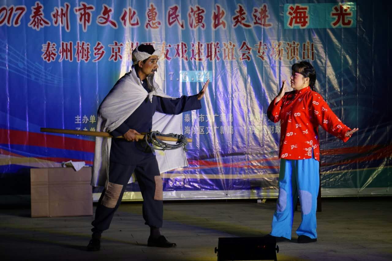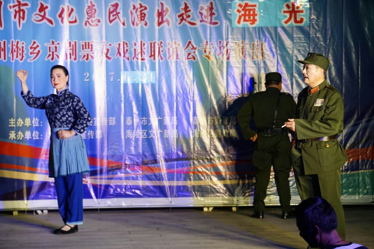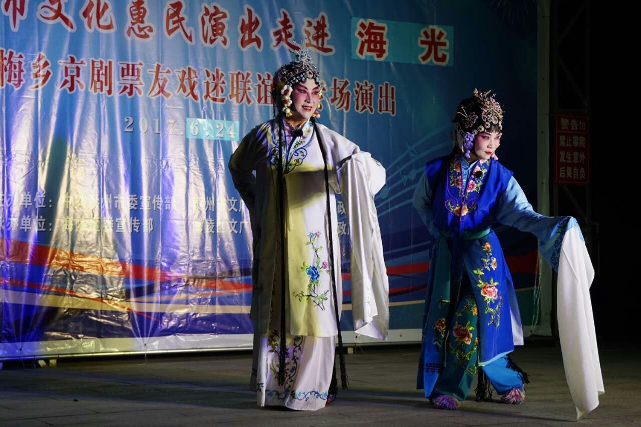 6月24日晚,梅乡京剧票友联谊会赴城西街道海光社区开展惠民演出活动,为居民们送上了一台高质量的京剧艺术大餐,让居民们过足了戏瘾。此次演出,主要以居民们比较熟悉的现代京剧为主,先后为居民观众们表演了《沙家浜》、《江姐》、《智取威虎山》、《白毛女》、《红灯记》、《海港》等剧目中的折子戏和经典唱段,其中穿插了传统京剧《锁麟囊》、《白蛇传》的两段经典折子戏。演员们通过彩唱、对唱、折子戏表演等形式轮番上场,把自己最出彩的舞台形象奉献给观众朋友。演出过程中,不时听到台下的居民观众不由自主地跟着演员有滋有味、有板有眼地唱起来,同时对每一个精彩节目都报以热烈的掌声和喝彩声。