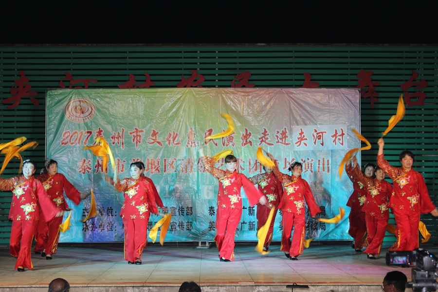 6月21日,姜堰区清瓴艺术团惠民演出走进沈高镇夹河村。夹河村地处偏僻,老百姓观看演出热情高涨,不少人提前一个多小时就早早的守候在场地上。整场演出以欢快热烈的舞蹈《走进新农村》拉开了序幕,锡剧《定能战胜顽敌渡难关》赢得了观众热烈的掌声,快板《赌博是祸》让广大观众得到深刻的启发教育,演出在舞蹈《张灯结彩》中结束。整场演出两个多小时,观众流连忘返,交口称赞在家门口享用了一场文化盛宴。