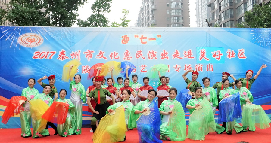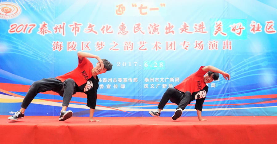 2017年6月28日下午,应城南街道美好社区邀请,海陵区梦之韵艺术团走进美好上郡小区,为美好社区的居民带来一台精彩的文艺演出。当天下午,铺着大红地毯的舞台搭建在美好上郡小区东大门,大批社区居民纷至沓来,居民们对这台演出表现出极大的热情和期待,没有坐的就自带凳子,或干脆站着,观众里三层外三层的簇拥在舞台前,形成一幅非常壮观的观众场面.......。演出如约开始,整齐的演员阵容,惊艳的荟萃节目、柔美的婀娜舞蹈、美妙的专业演唱、青春的动感街舞,诙谐的幽默小品.......博得观众阵阵掌声,110分钟的演出在观众的热烈喝彩声中华丽落幕......。