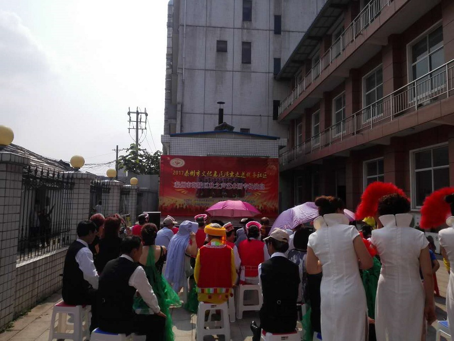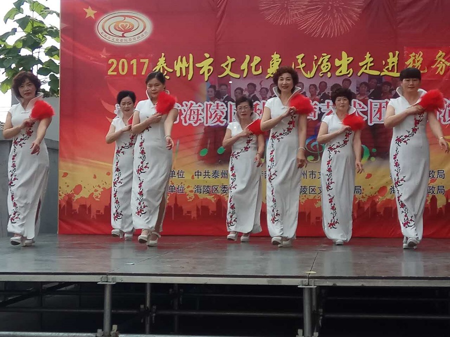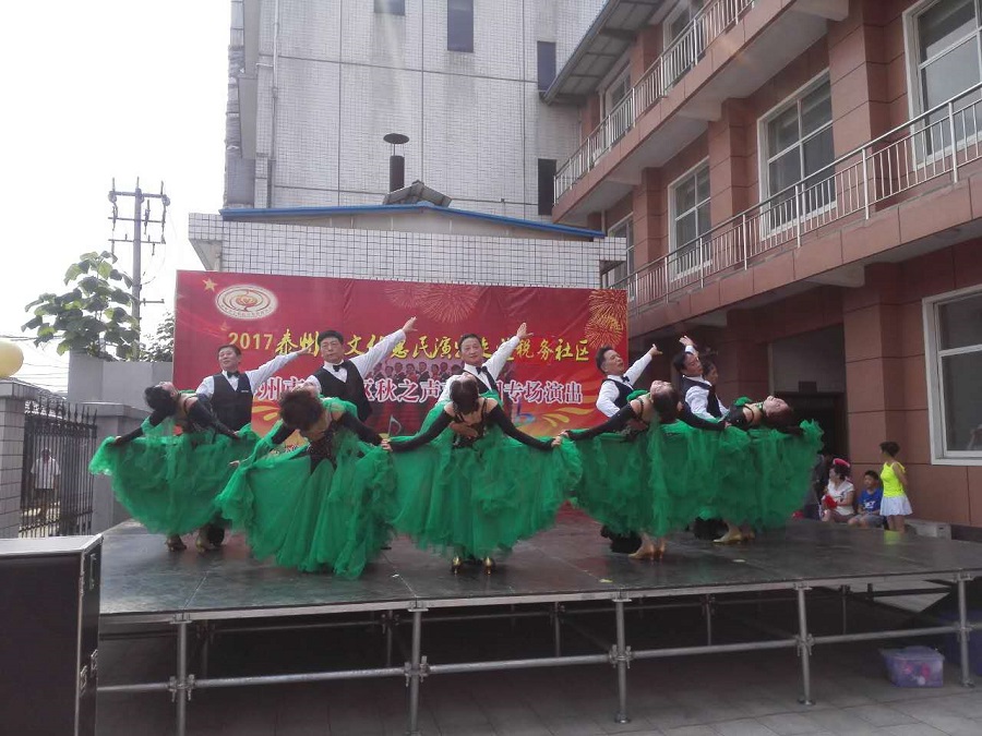 六月二十九号下午三点,泰州市海陵区秋之声艺术团应泰州海陵区城中街道邀请惠民演出走进税务社区。当日下午在该社区广场观众达一百多人。该团舞蹈美丽中国梦、走秀远方的思恋、男声四重唱少林少林、葫芦丝合奏映山红等精品节目。全场掌声不断欢声雷动,把演出推向高潮,当谢幕曲难忘今宵奏响时,观众依依不舍,整场演出给社区、观众留下了良好的印象。