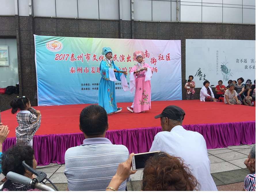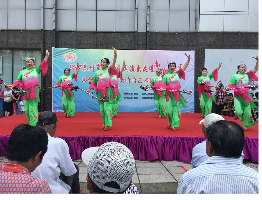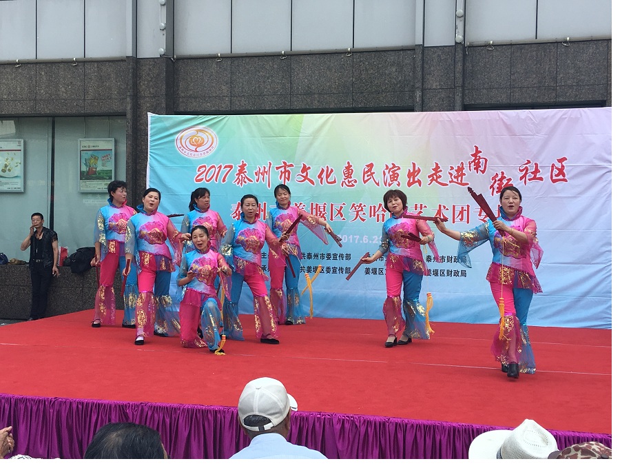 6月29日,姜堰区笑哈哈艺术团文化惠民专场演出走进罗塘街道南街社区。下午2点演出在坝口工行东侧准时开始,现场表演的节目有舞蹈《红红火火大中华》、莲花落说唱《莲花一打笑哈哈》、方言韵白《洗澡》、萨克斯演奏《北国之春》、方言韵白《拐过弯来是幸福》、天津快板《有话好好说》、相声《趣说泰州话》、越剧梁山伯与祝英台选段《十八相送》、表演唱《财政惠民乐农家》、以及独唱等11种形式、12个节目。整台演出时长115分钟,观众约800人左右。节目形式多样、内容丰富,尤其相声、快板、喜剧小品、方言韵白等语言类特色节目赢得了观众的阵阵笑声和掌声,受到了社区干部、群众的一致好评。