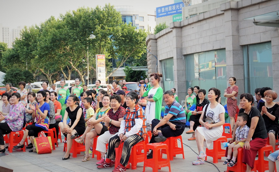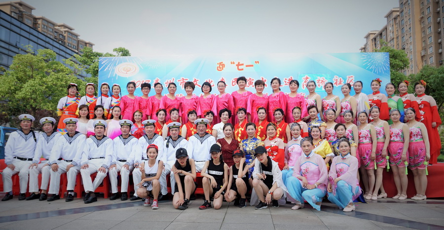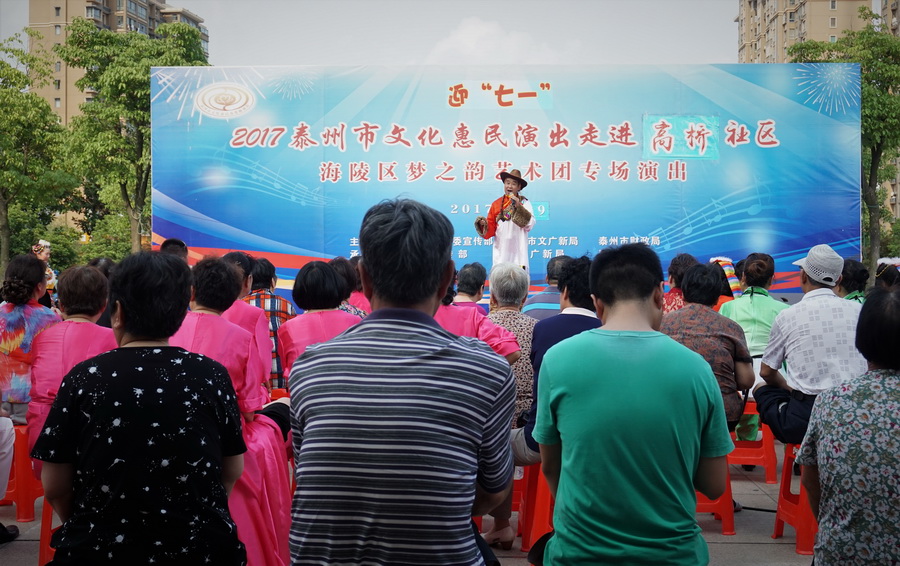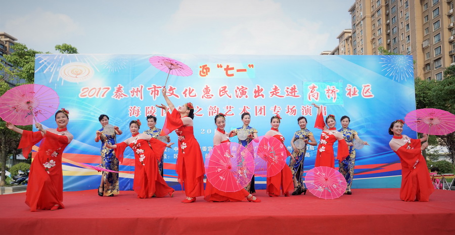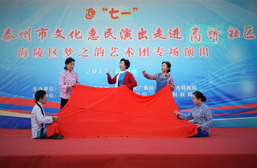 2017年6月29日下午,位于城区中心的铁塔公园里人头攒动,热闹非凡,一铺有大红地毯的舞台横空出现,舞台背景上的“庆七一”红色大字格外醒目,应城中街道高桥社区邀请,海陵区梦之韵艺术团今天走进高桥社区,为社区居民展示精美的文艺大餐。为惠及周边居民,梦之韵艺术团将演出舞台搭建在铁塔公园里.......,欢快喜庆的《中国结》,古朴俏皮的《俏晨曦》、千妖百魅的《梨花情》、轻步曼舞的《桃花扇》、正气凛然的《绣红旗》、激情演绎的《党啊,亲爱的妈妈》、异域风情的《凉凉》、青春劲爆的《炫舞青春》、捧腹逗乐的《卖鸡蛋》.....,靓丽的舞台、悦动的音乐、倾情的演员、热情的观众,为铁塔公园增添一道独特的风景.....。