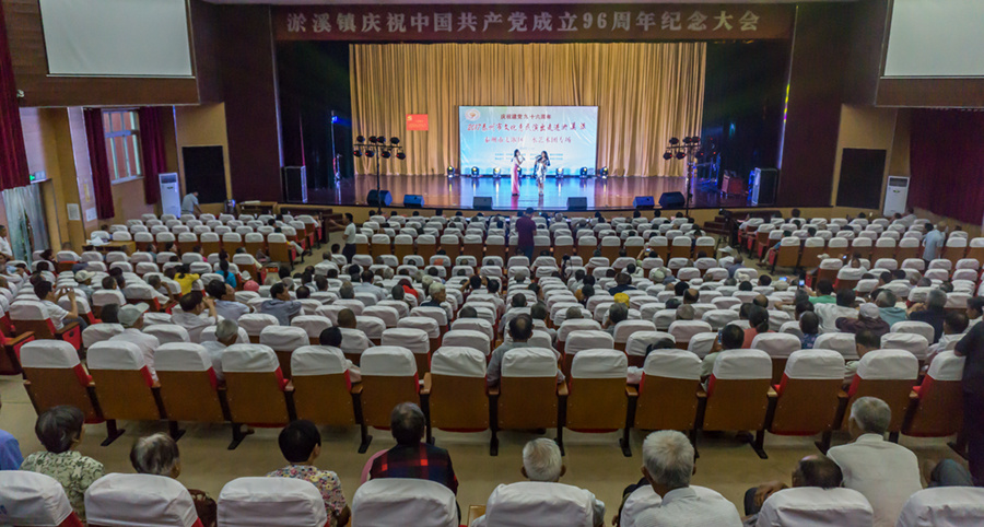 7月1日上午,淤溪镇党委、政府在该镇文体中心大会堂召开庆祝大会,庆祝中国共产党成立96周年。特邀姜堰区三水艺术团赴会并参加演出。此次演出政治喜庆氛围十分浓厚,艺术团领导相当重视精心准备,挑选本团精品节目,奉献给淤溪镇的党员代表。参演的13个节目内容丰富、形式多样。有民乐合奏、独奏、锡剧、京剧、独唱、小品等等。整场演出围绕中心,贴近群众的生活。观众反映很好。与会代表说三水艺术团实力不一般,演出阵容强大,在庆"七·一"大会上,给我们淤溪的老百姓送来了丰富的精神文化大餐。演出时长100分钟,观众近800人。