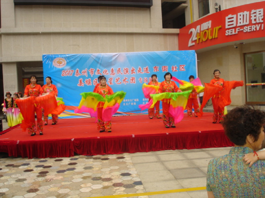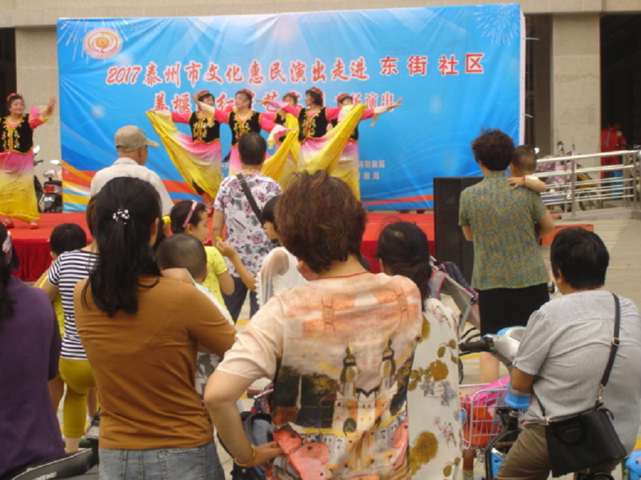 红星艺术团应东街社区的邀请来到东街社区进行演出,下午三点闪亮登场,开始观众并不多渐渐观众越来越多,场地马路上站满了观众,台上精彩的表演,台下传来热烈的掌声,演出结束了观众们还不愿意散去,在评价我们的表演。