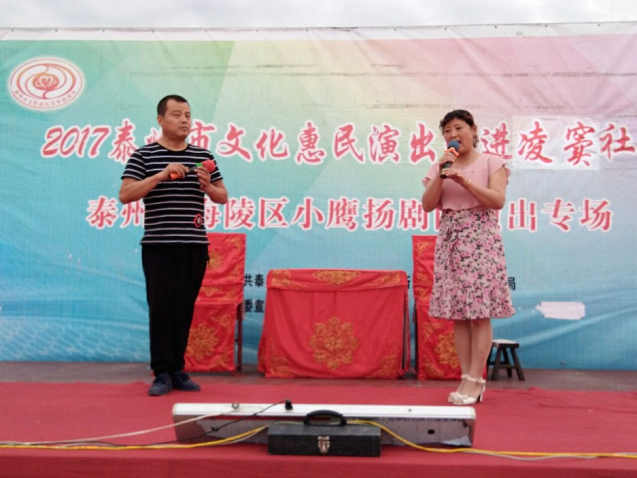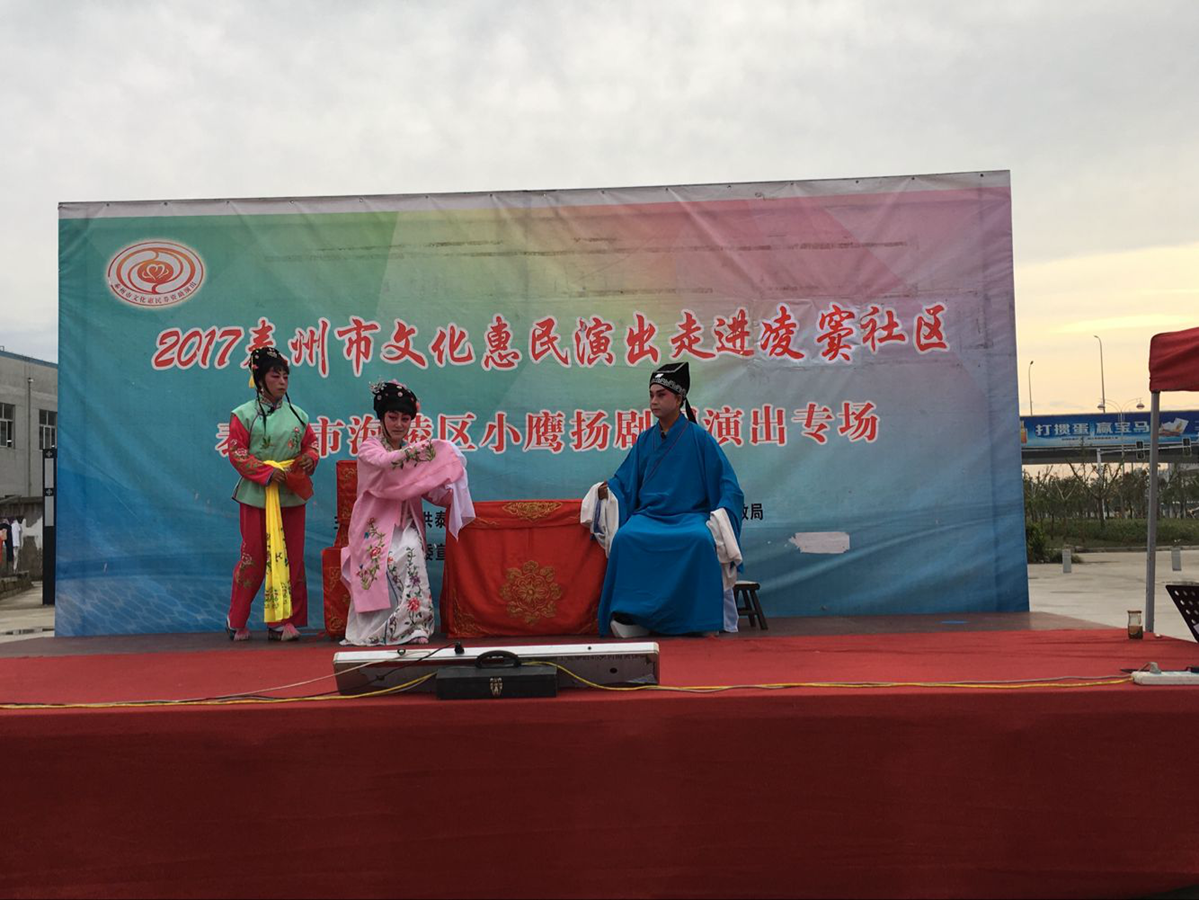 2017泰州市文化惠民演出走进海陵区京泰街道凌窦社区,海陵区小鹰扬剧团专场演出,2017年7月1日晚上在海陵区京泰街道凌窦社区篮球场成功举办。经典的扬剧折子戏博得了观众的阵阵掌声。演出结束后,观众迟迟不肯离场,应戏迷观众再三要求,团长又加场了几段扬剧经典的唱段。演出很成功!感谢社区领导提供全方位的服务!