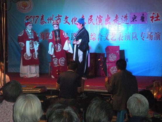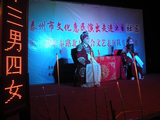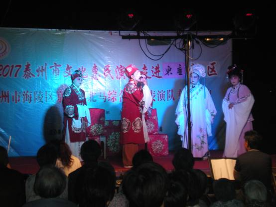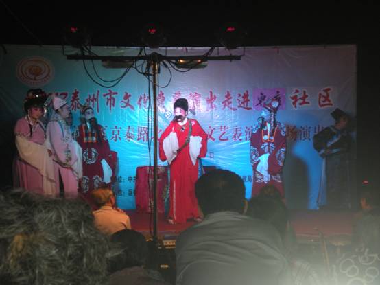 晚,海陵区京泰路北马综合文艺表演队走进京泰东唐社区,在社区干部进行广泛的宣传基础上,广大居民纷纷赶到东唐社区文化广场看演出,本次演出的曲目为古装戏扬剧《借妻》,情节感人,演出效果深受居民的喜爱。这次戏曲进社区的演出受到社区居民的一致好评,社区干部和文化志愿者服务周到,并希望惠民演出活动走进社区,满足不同层次的文化需求。