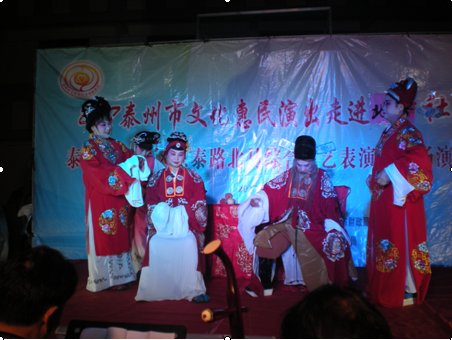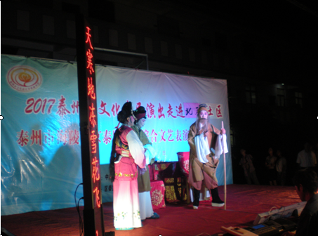 6月29日晚,海陵区京泰路北马综合文艺表演队走进北马社区,在社区干部进行广泛的宣传基础上,广大居民纷纷赶到北马社区文化广场看演出,本次演出的曲目为古装戏扬剧《五女拜寿》,情节感人,演出效果深受居民的喜爱。这次戏曲进社区的演出受到社区居民的一致好评,社区干部和文化志愿者服务周到,并希望惠民演出活动走进社区,满足不同层次的文化需求。