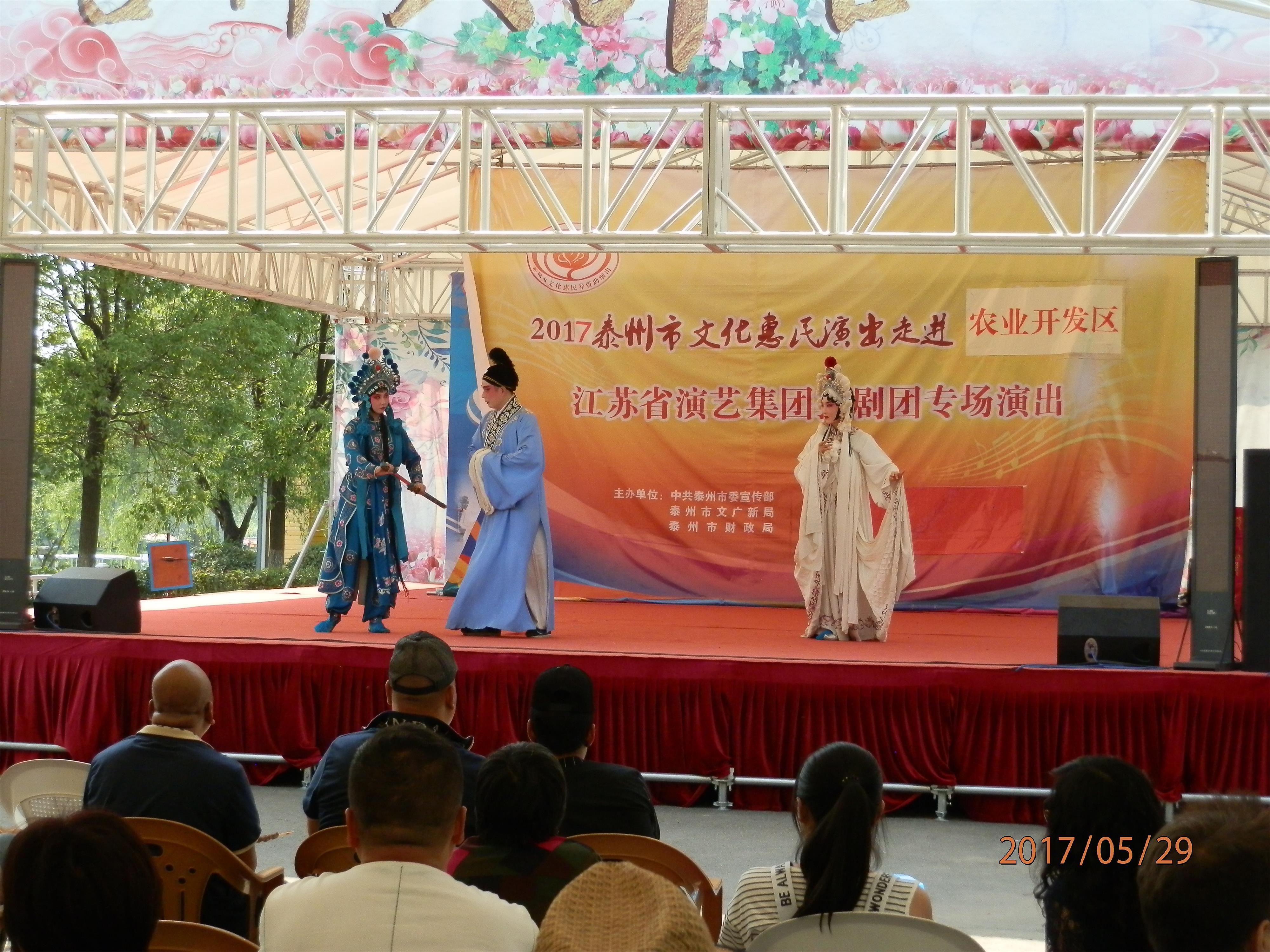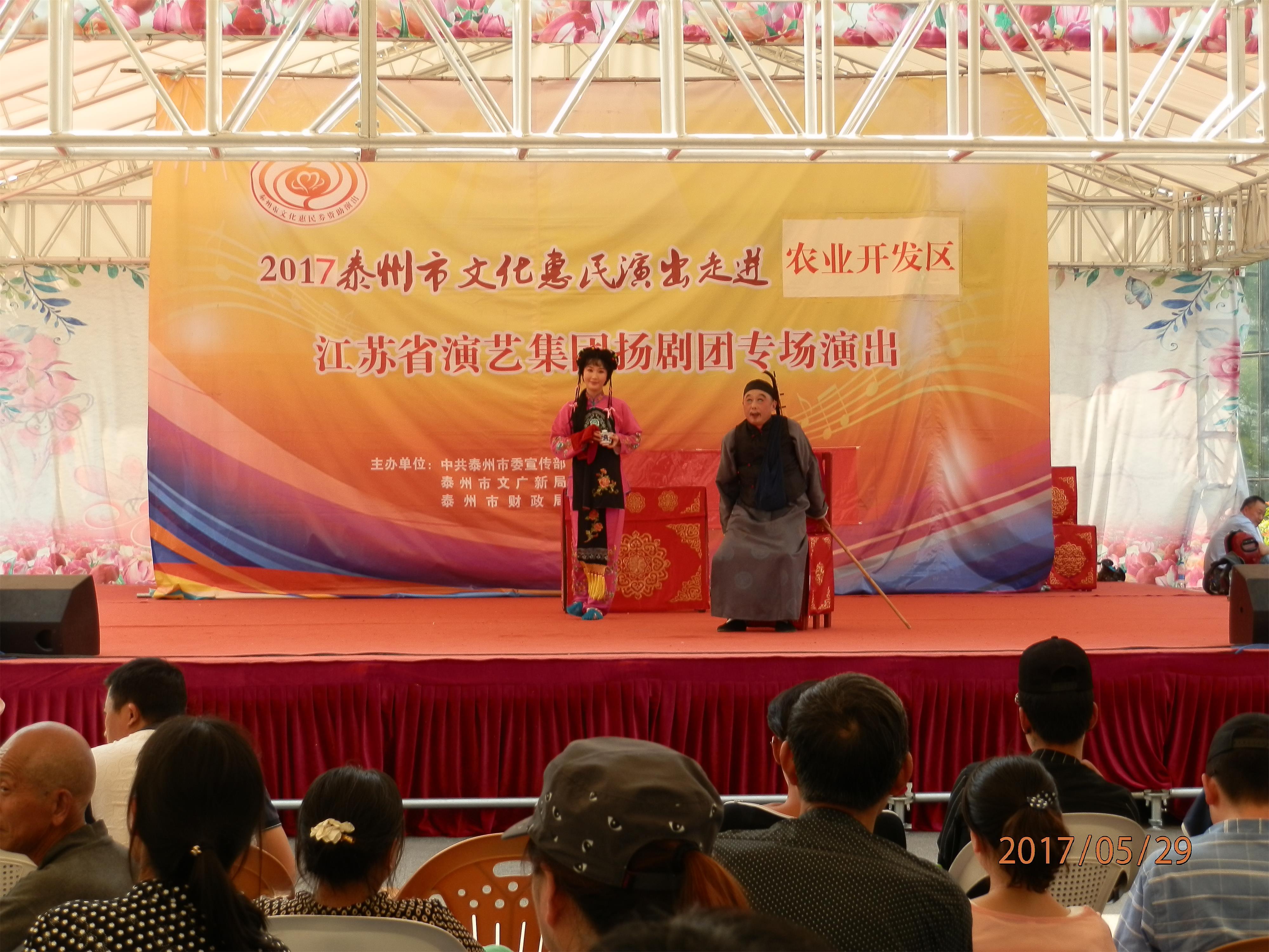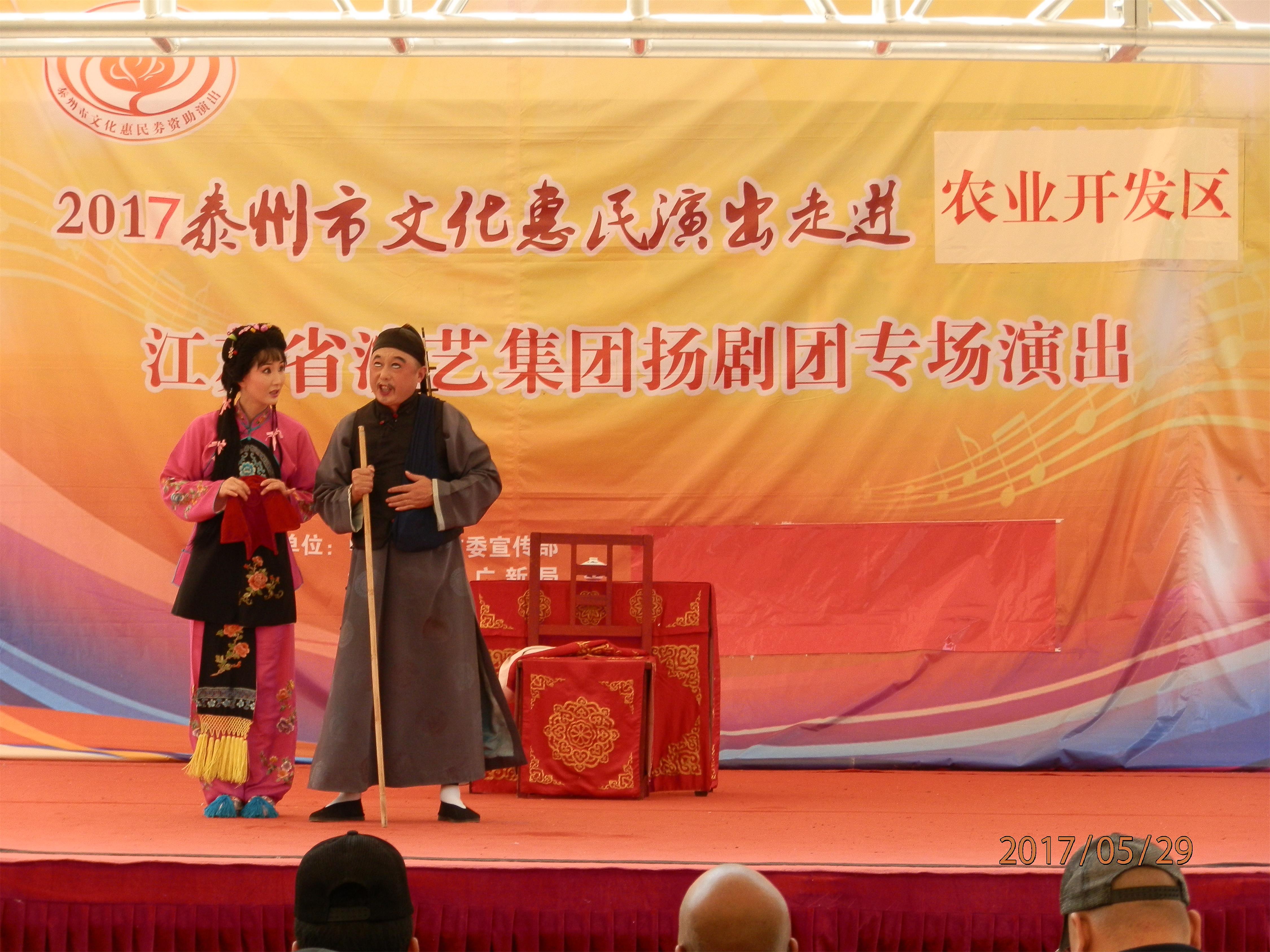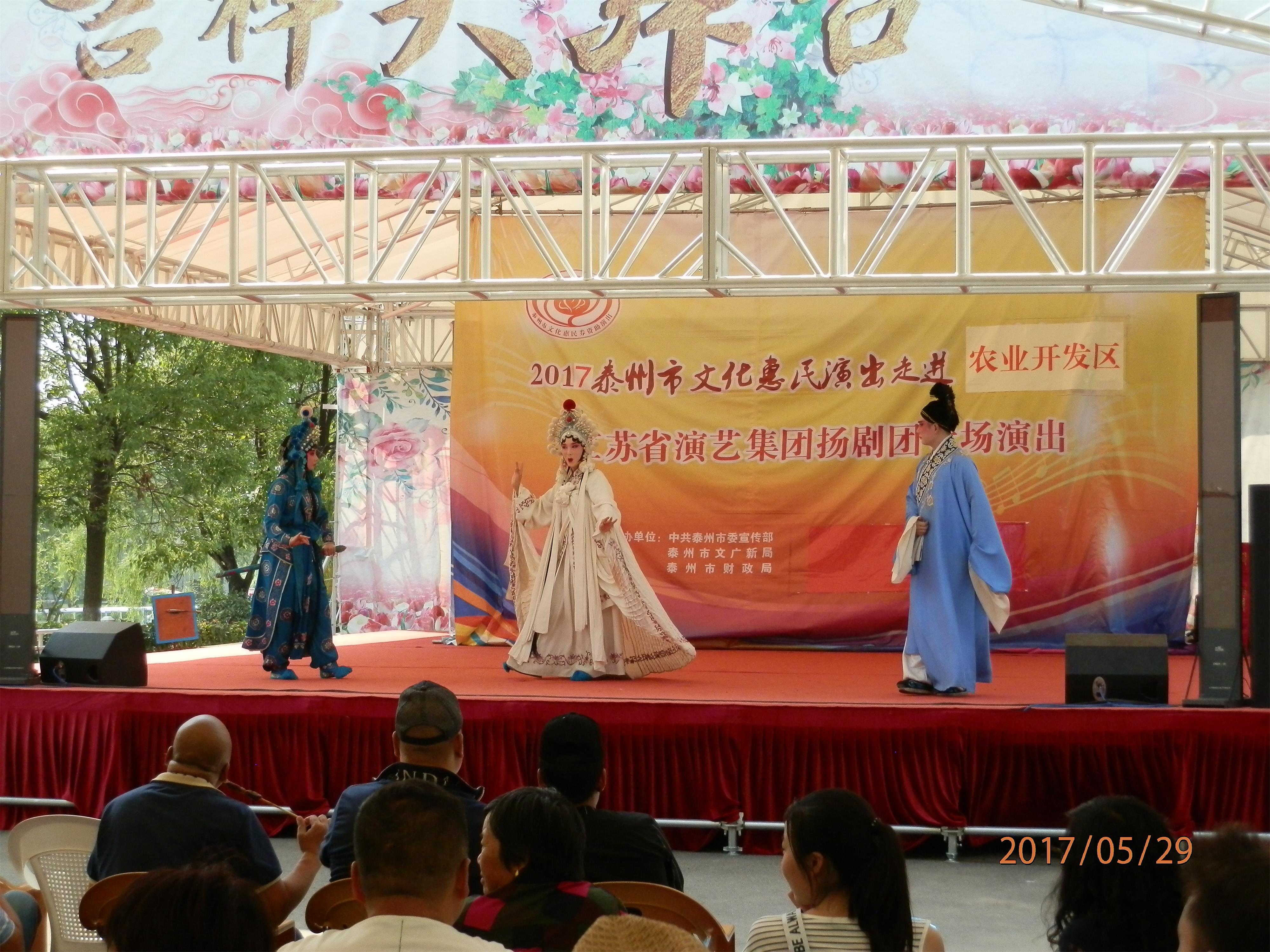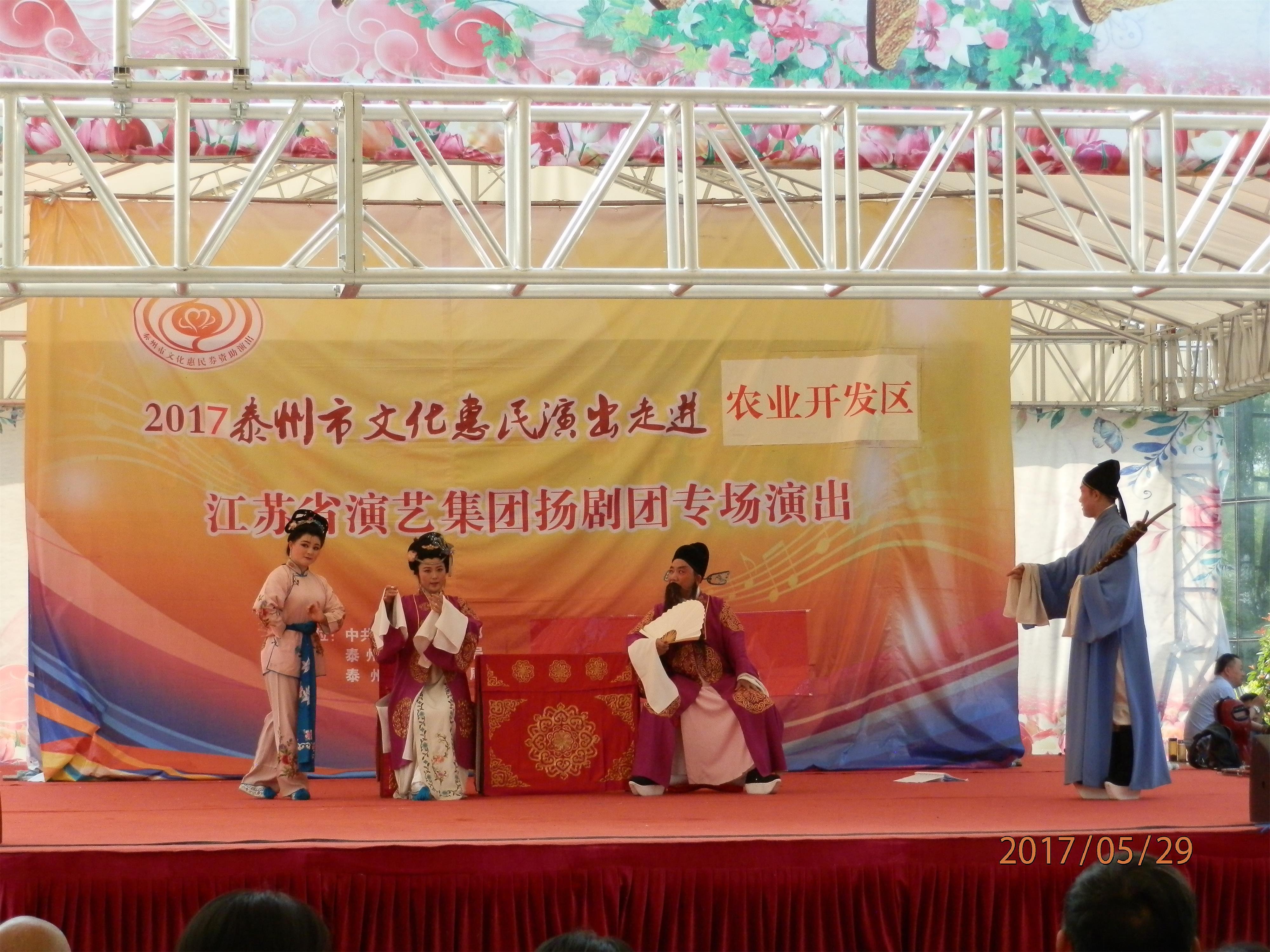 江苏省演艺集团扬剧团2017年5月29日 走进泰州市农业开发区,为群众送去了《瞎子算命》、《白蛇传·断桥》、《方卿羞姑》、《打神告庙》四折精彩折子戏,受到当地群众的热烈欢迎。