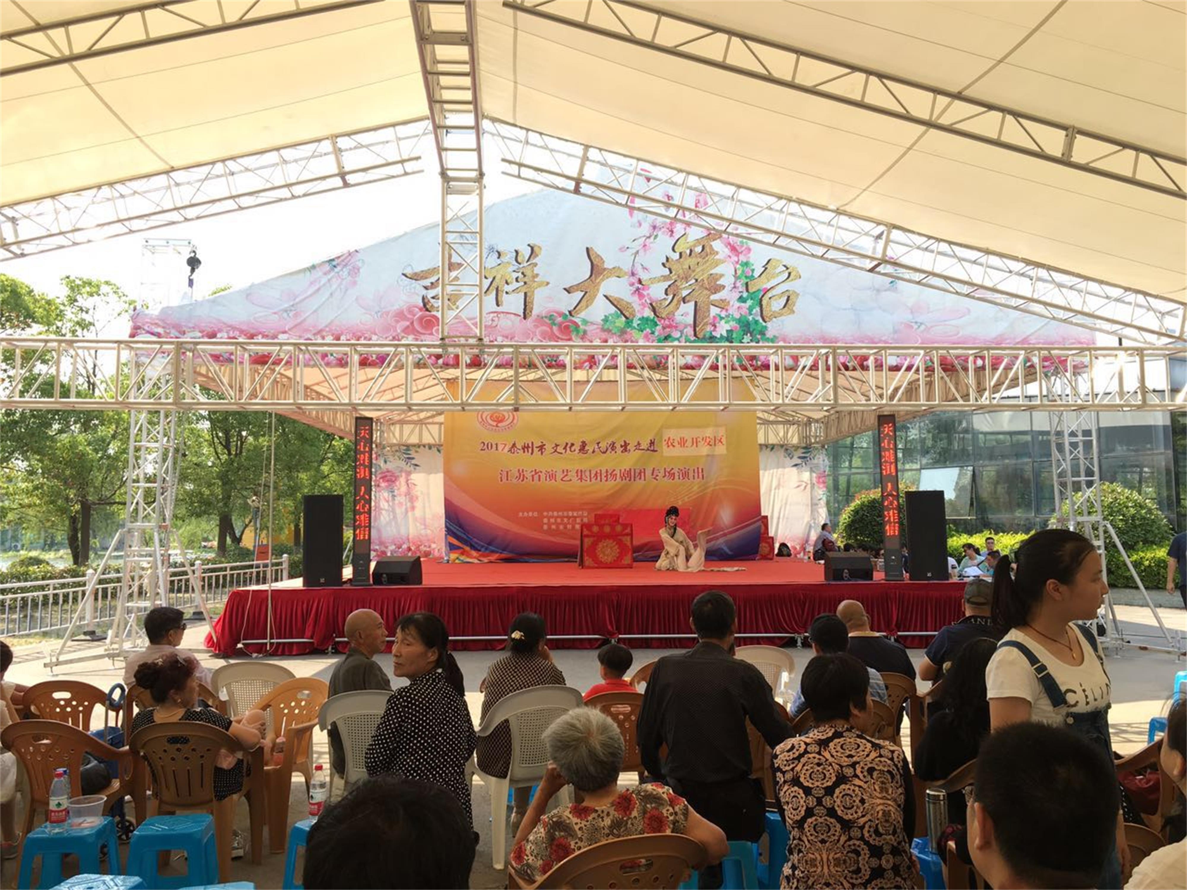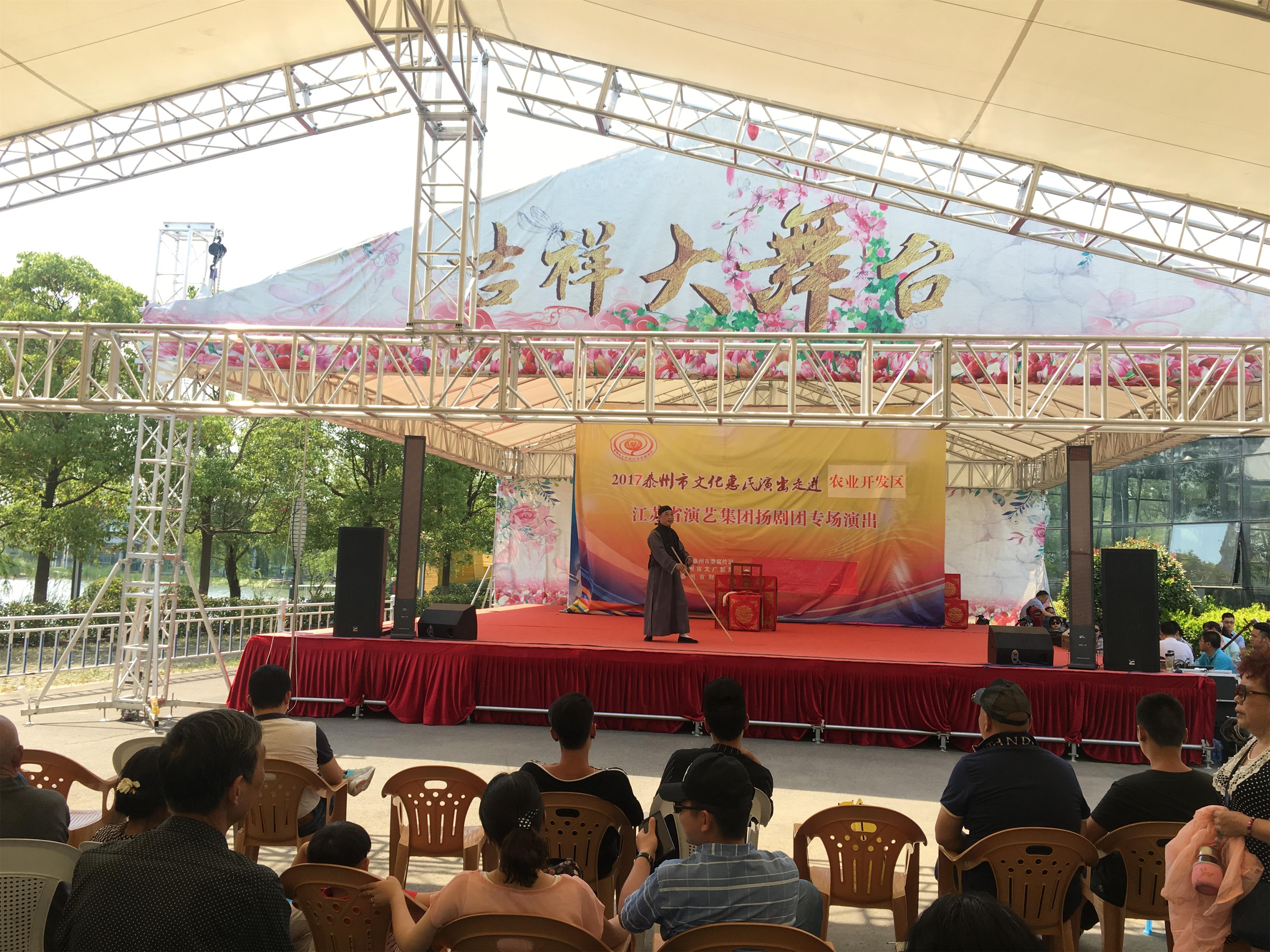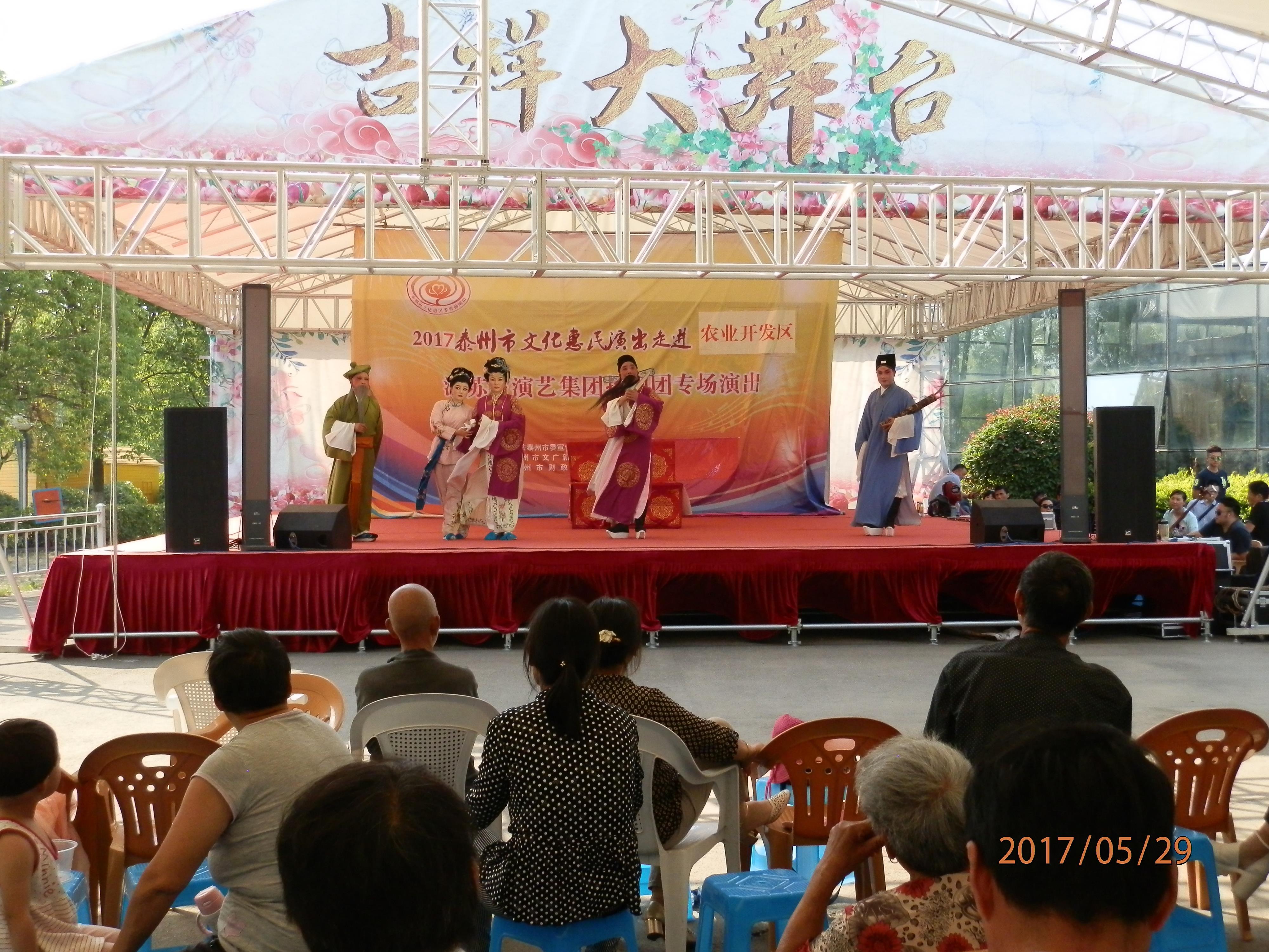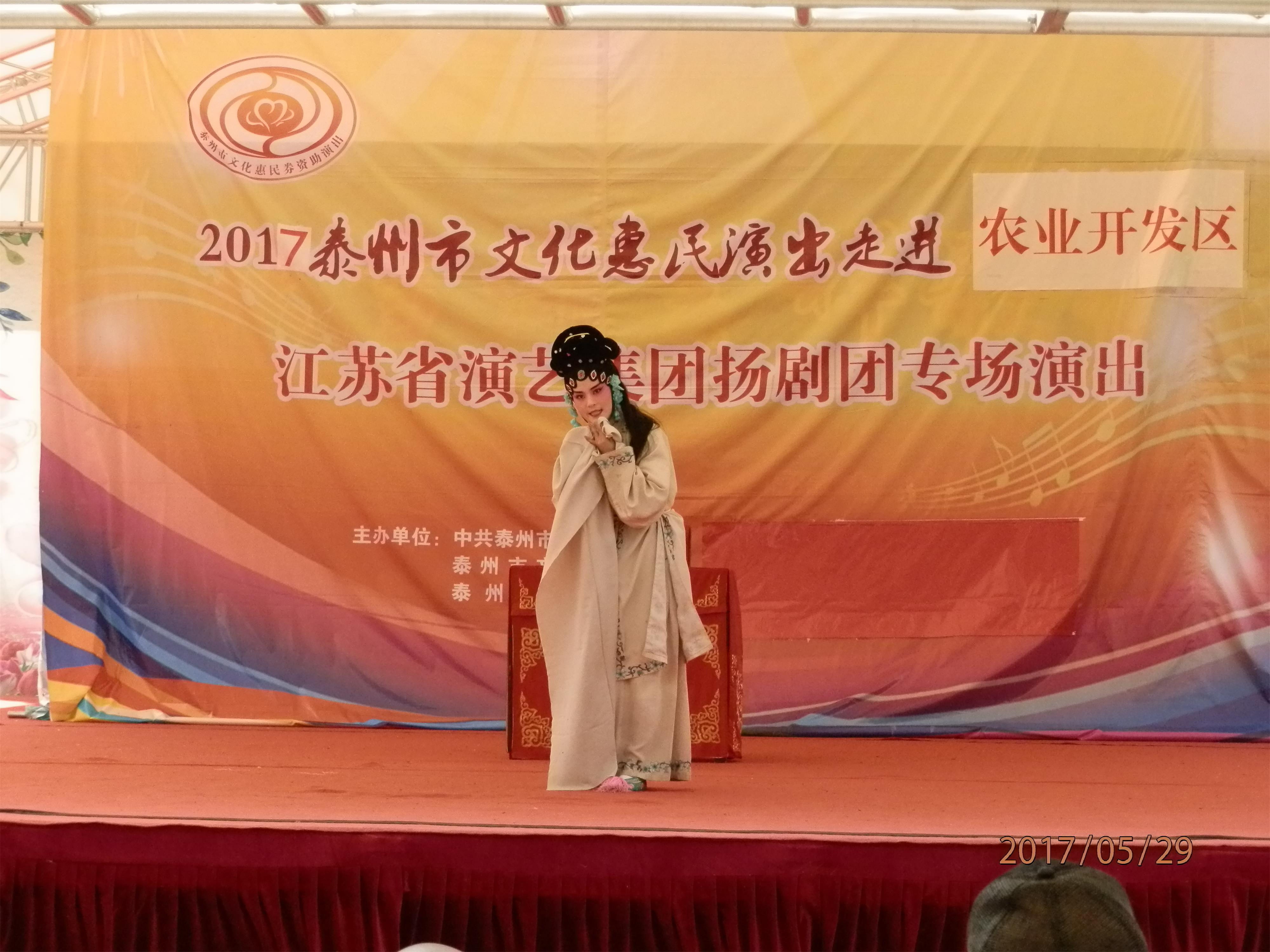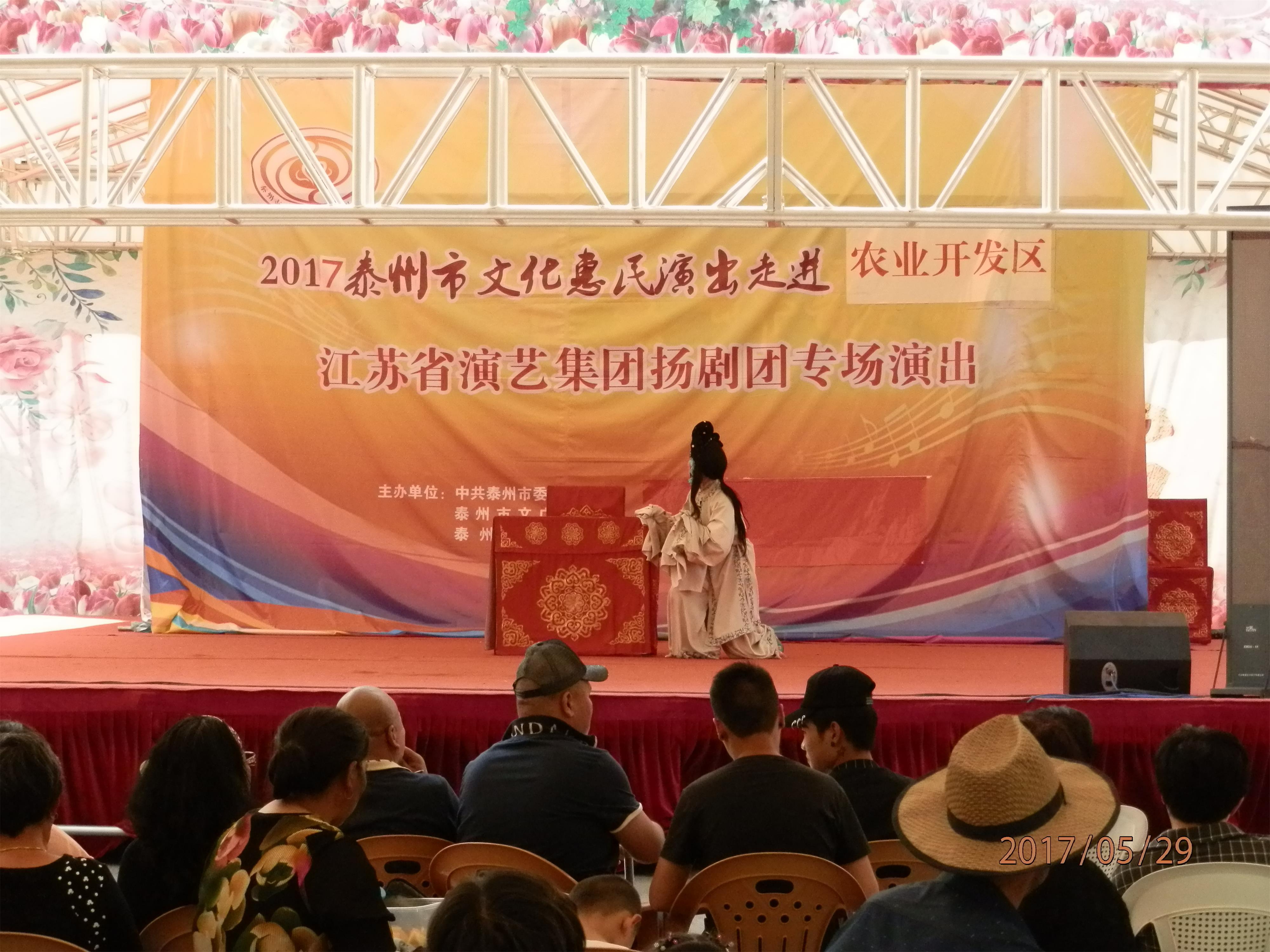 江苏省演艺集团扬剧团2017年5月29日 走进泰州市农业开发区,为群众送去了《瞎子算命》、《白蛇传·断桥》、《方卿羞姑》、《打神告庙》四折精彩折子戏,受到当地群众的热烈欢迎。