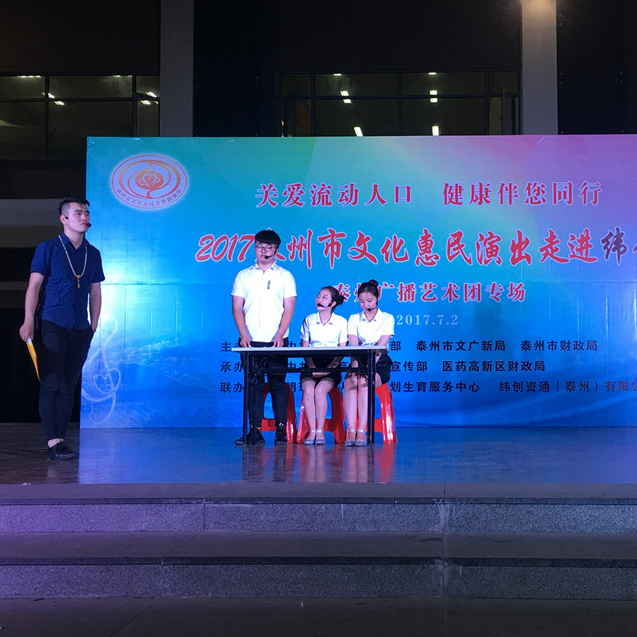 按照省委、市委关于文艺下乡的指示精神,为深入宣传科学发展观活动,推进文化惠民工程的开展,进一步丰富广大群众的文化生活,7月2日晚上六点,泰州广播艺术团主办了主题为“关爱流动人口,健康伴你同行”的文化惠民活动。泰州广播艺术团走进明珠街道纬创,并且精心编排了一台精彩的文艺节目,在纬创开展文艺汇演活动。在各级领导的高度重视和大力支持下以及全体演职人员的共同努力下,文艺演出通过舞台艺术活动的开展满足了广大群众日益增长的精神文化需求,丰富了纬创员工的文化生活,取得了良好的政治效益和社会效益。