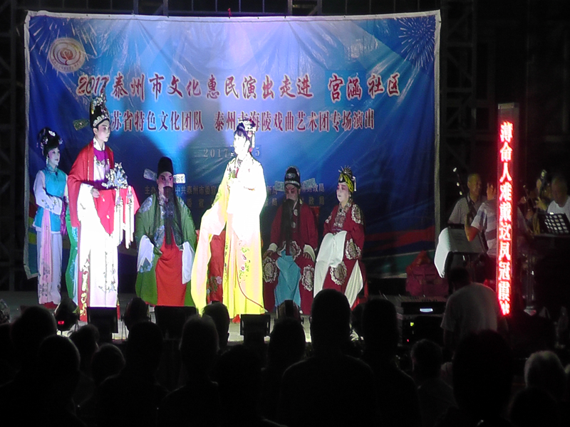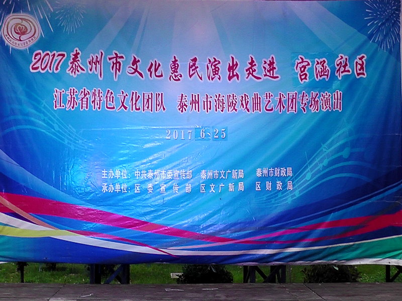 泰州市海陵戏曲艺术团于2017年6月25日晚7时30分在城东街道宫涵社区广场演出大型优秀传统扬剧——《碧玉簪》。我团参演人员25人。由于宫涵社区积极宣传,前来看戏的群众300余人,人民需要文化,文化需要人民,演出现场气氛热烈,观众掌声不断,演出圆满成功。这更加激起我们为老百姓排好戏、演好戏、唱好戏。把泰州市文化惠民演出活动锦上添花,更上一层楼。